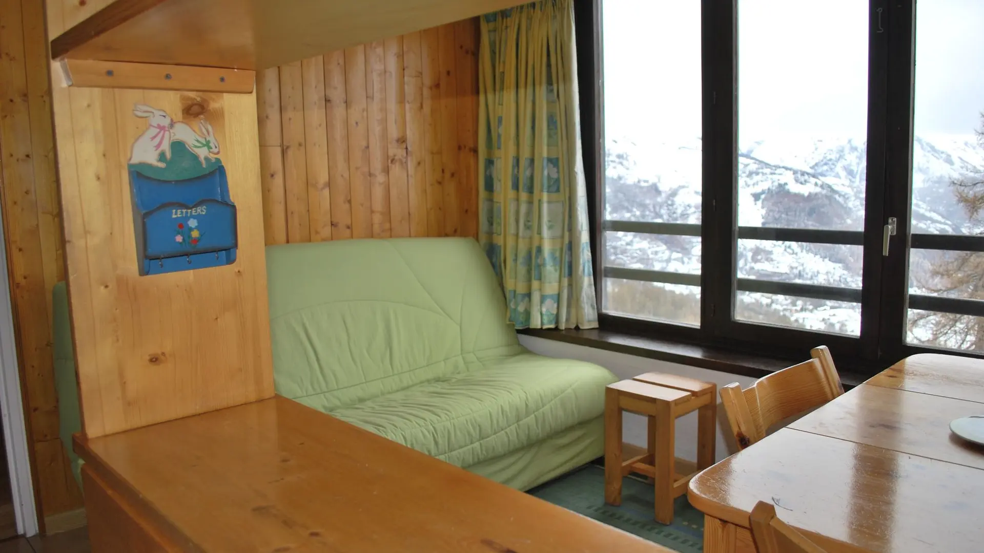 Le séjour est meublé d'un canapé et du coin repas. Il offre une vue dégagée et panoramique sur la vallée de Vallouise et les sommets du Parc des Écrins