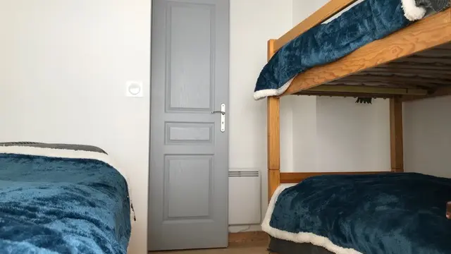 Il bénéficie d'un balcon et un accès au jardin. Il y a trois chambres une avec un lit double, et accès de plein pied de l'arrière du bâtiment, une autre chambre avec des lits superposés t un lit simple, et la troisième chambre avec soit deux lits 80X90 ou un lit 60X190, avec une salle de douche.