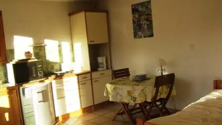Grande pièce avec coin cuisine, un grand lit pour 2 personnes, une salle d'eau et une terrasse.