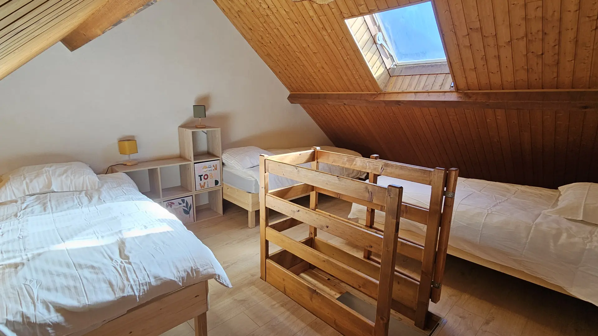 Au 2ème étage, on a une chambre sous toit avec 3 lits en 90x 190cm.