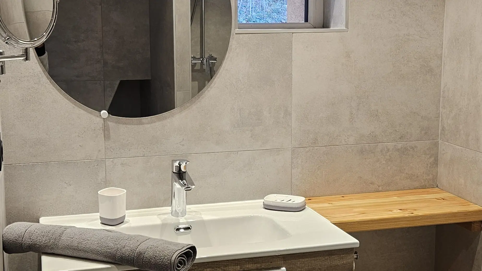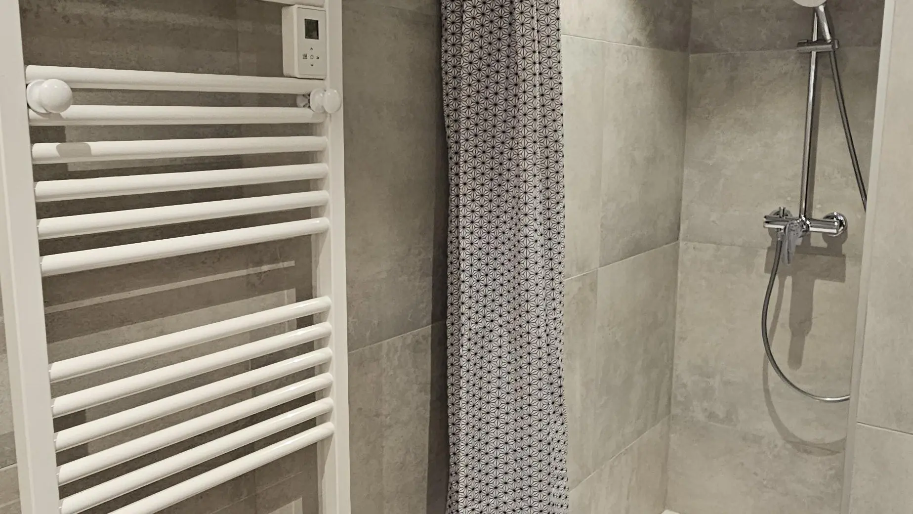 Au 1er étage, il y a la chambre parentale avec un lit en 180x200cm, un bureau, un coin rangement et la salle d'eau avec douche à l'italienne et WC.