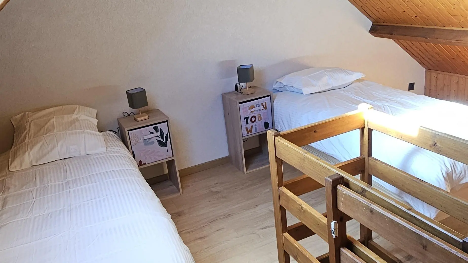 Au 2ème étage, on a une chambre sous toit avec 3 lits en 90x 190cm.