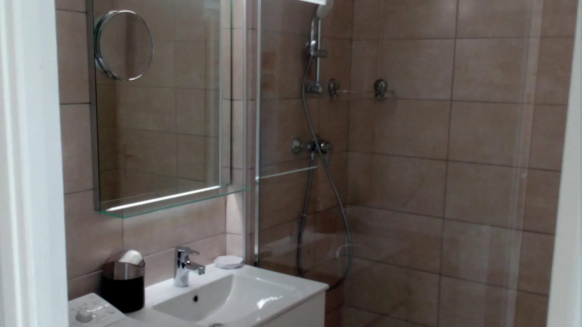 40 m² habitables, 2 pièces dont 1 chambre, 2 lits doubles, grand placard dans la chambre, aspirateur, salle de bains (douche à l'italienne, lave linge) et WC séparés.