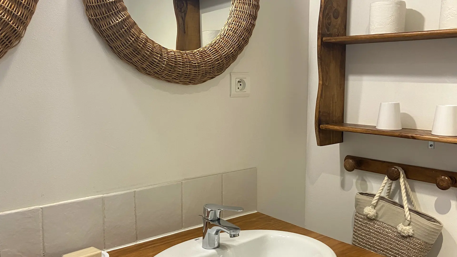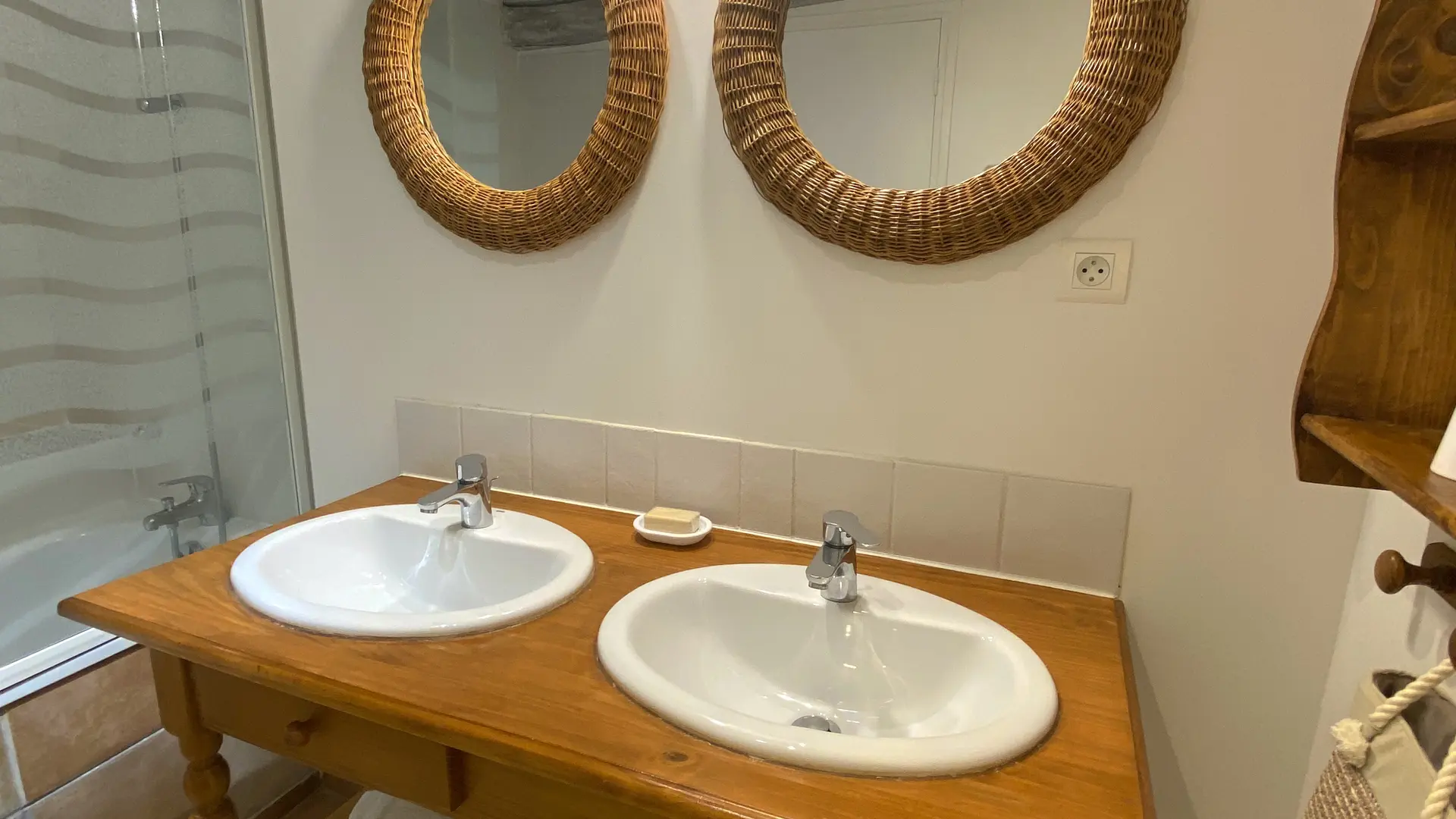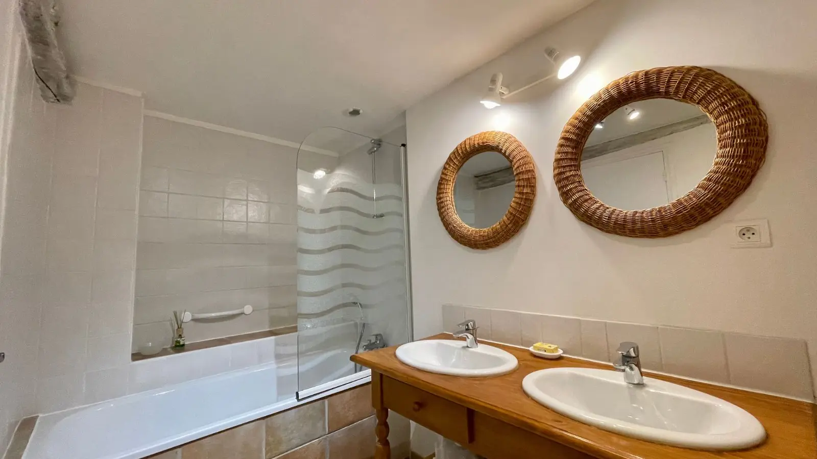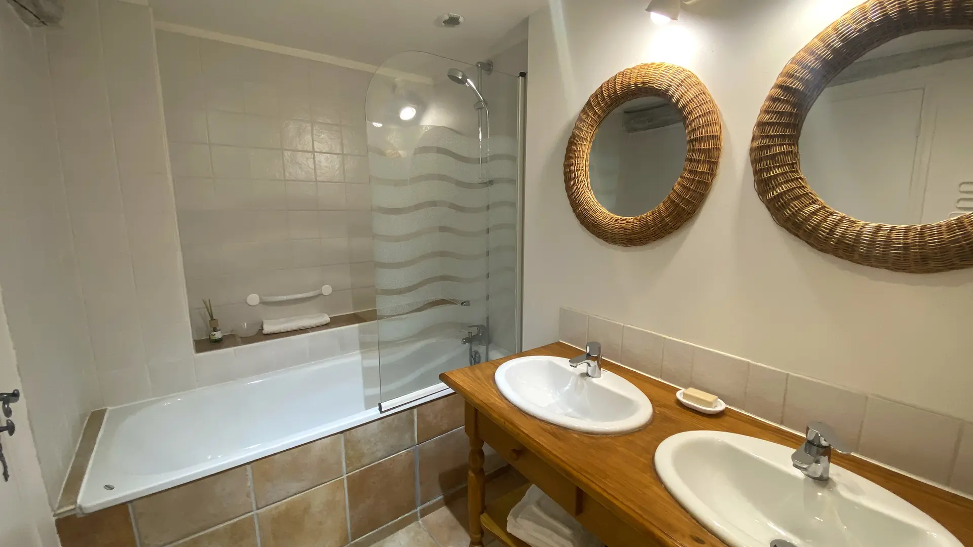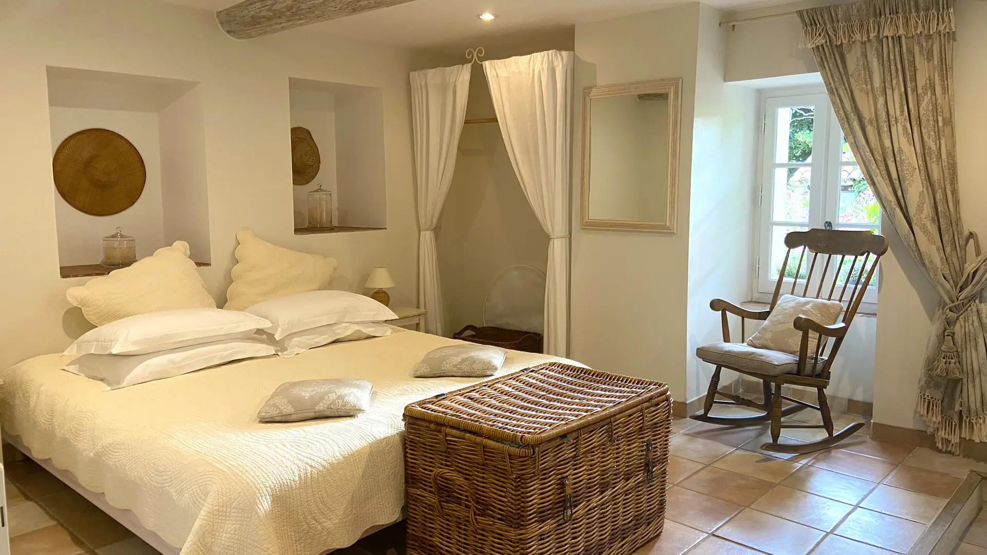 Située au rez-de-chaussée, la chambre Le Vieux Village offre une atmosphère douce et authentique, idéale pour un séjour au calme. Elle dispose d’un lit king size (180×200), pouvant être séparé en deux lits simples sur demande préalable, et d’une salle de bain équipée d’une baignoire avec douche intégrée.