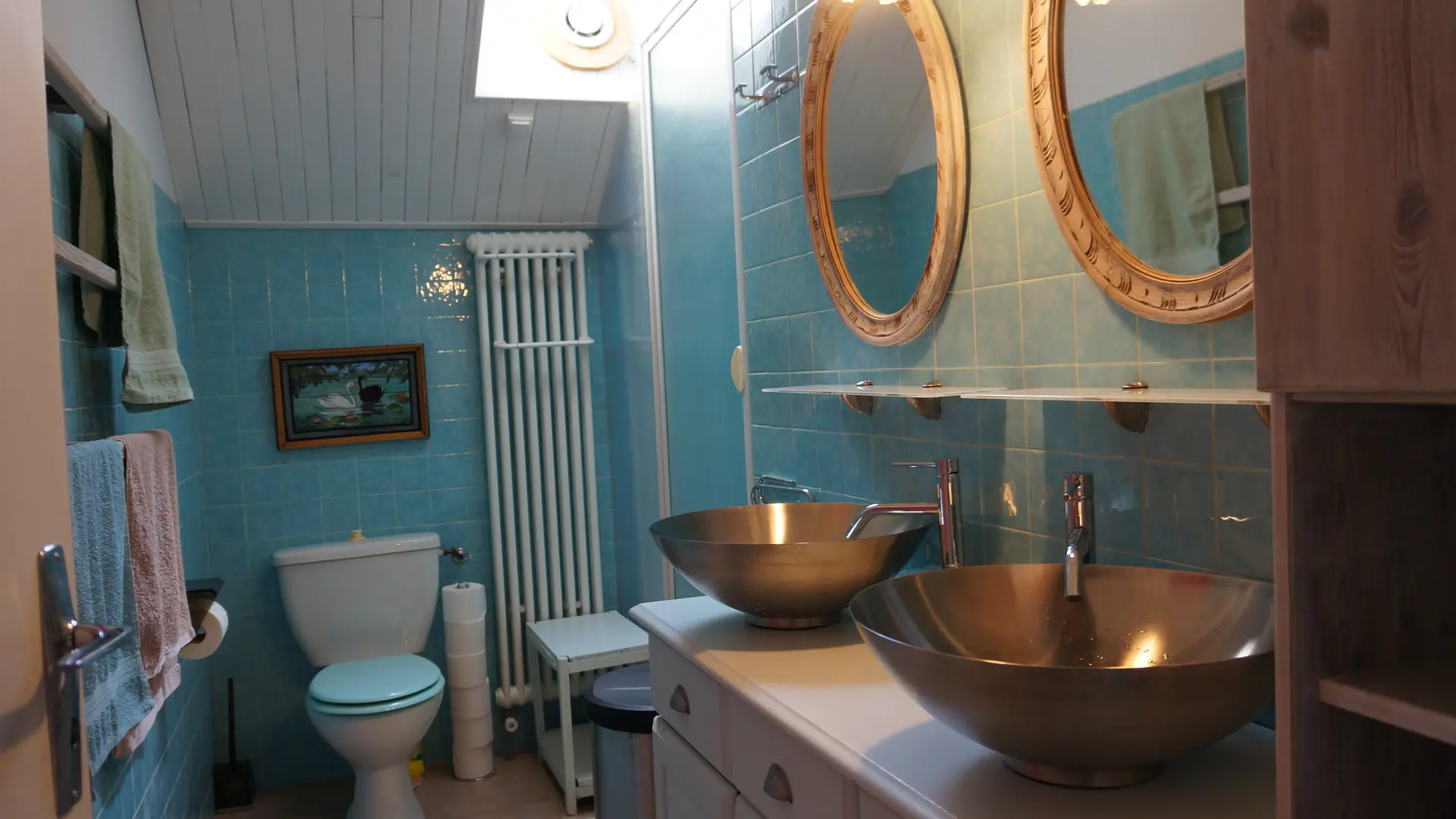 Chambre bleue : au premier étage une chambre calme et grande avec deux lits simples et un lit double. Une ambiance de chalet à la décoration élaborée.