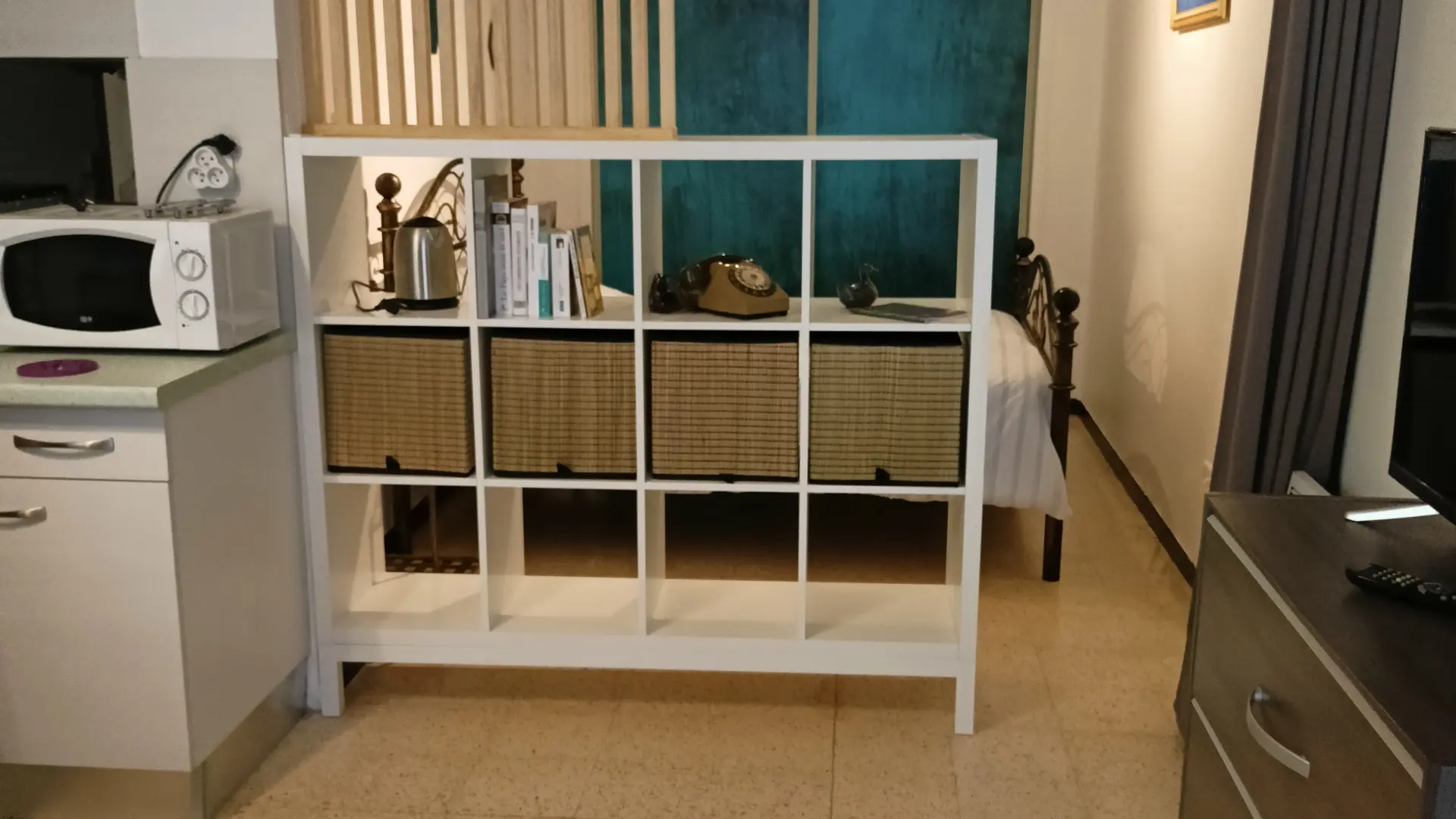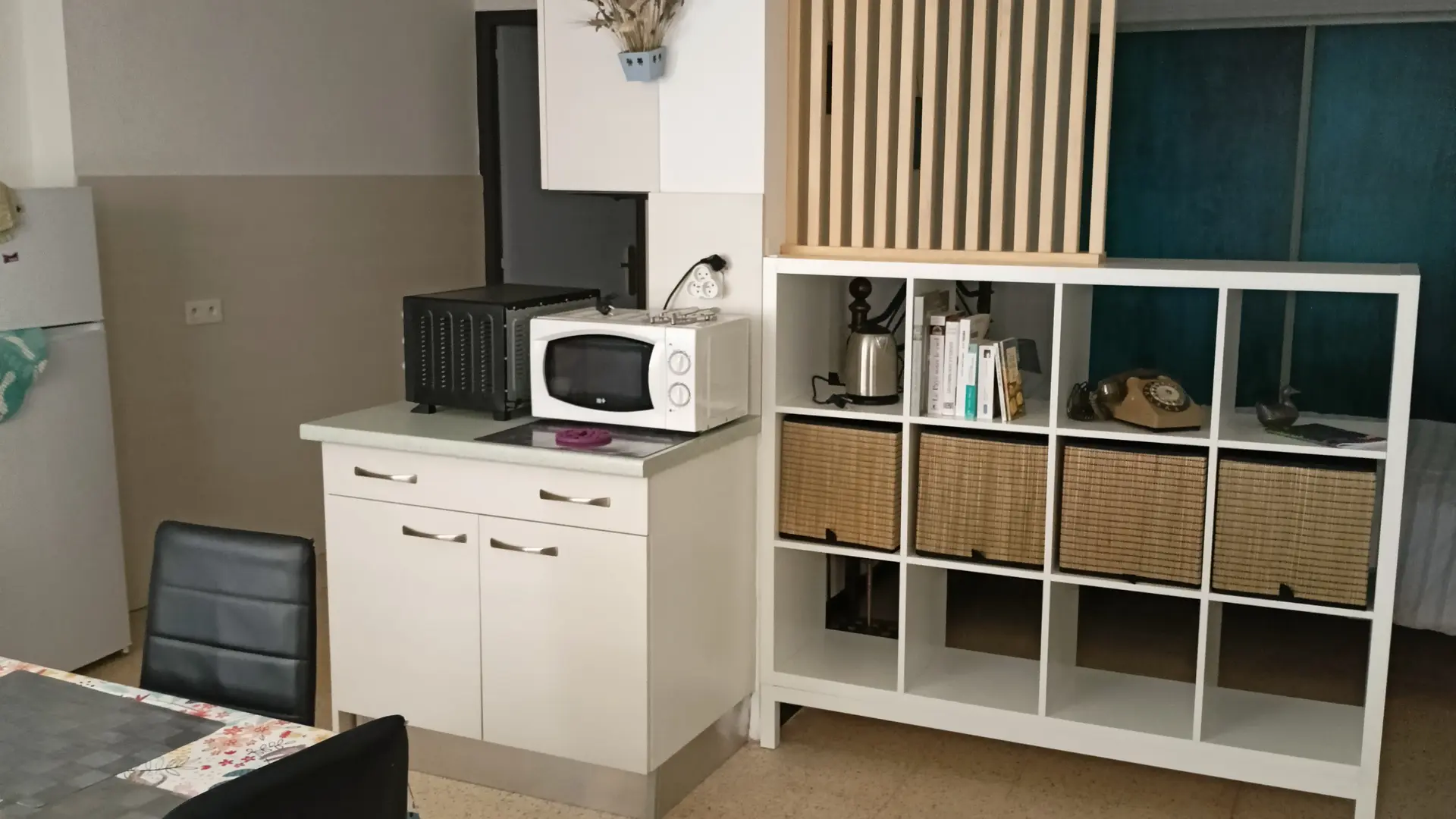 Coin nuit séparation par rideaux : un lit 140/190, grand placard.
