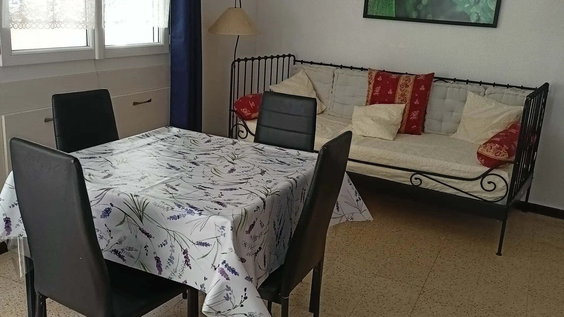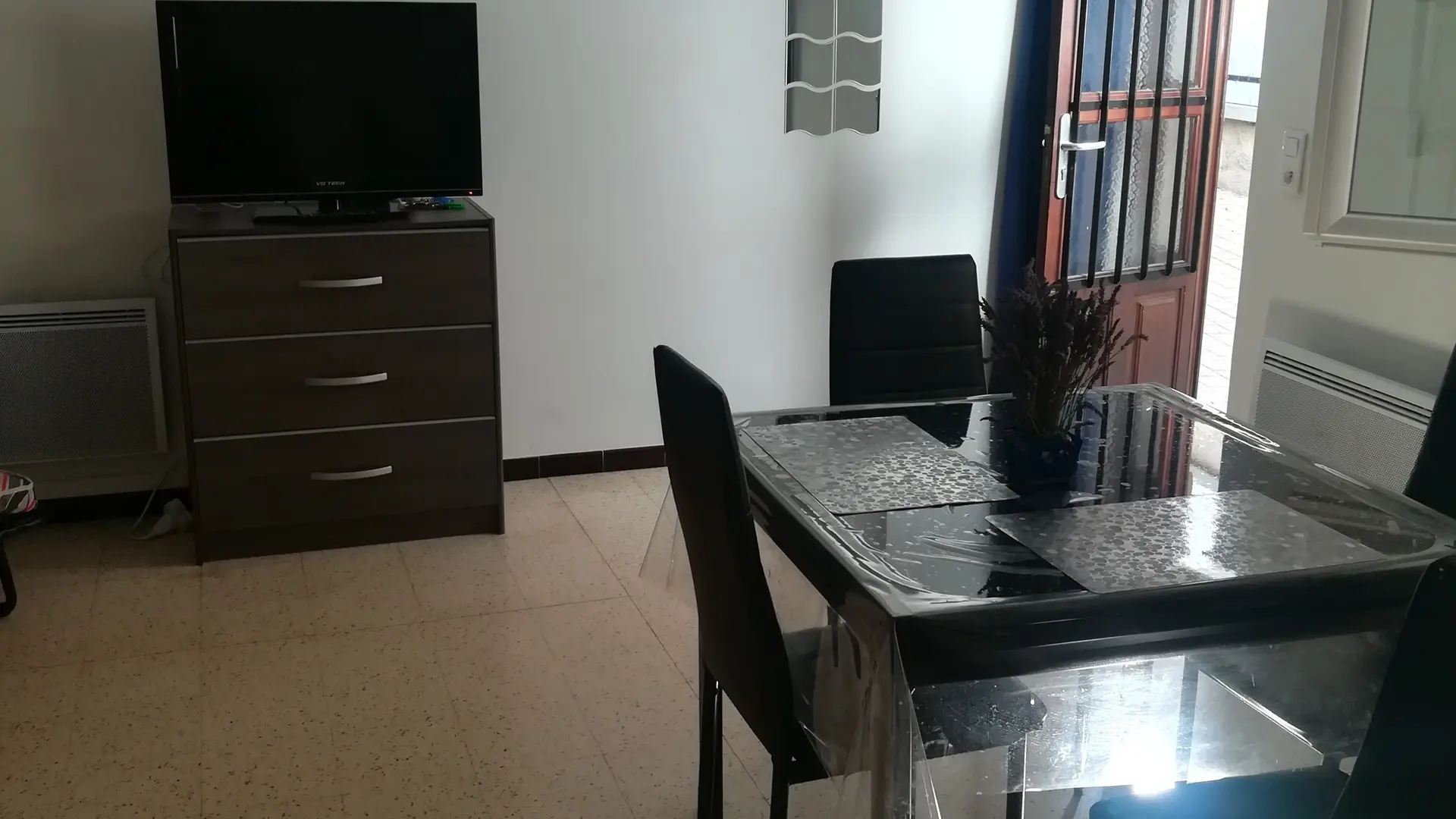 Salon/salle à manger : 4 chaises, une table, un canapé lit 90/190, commode, TV écran plat,