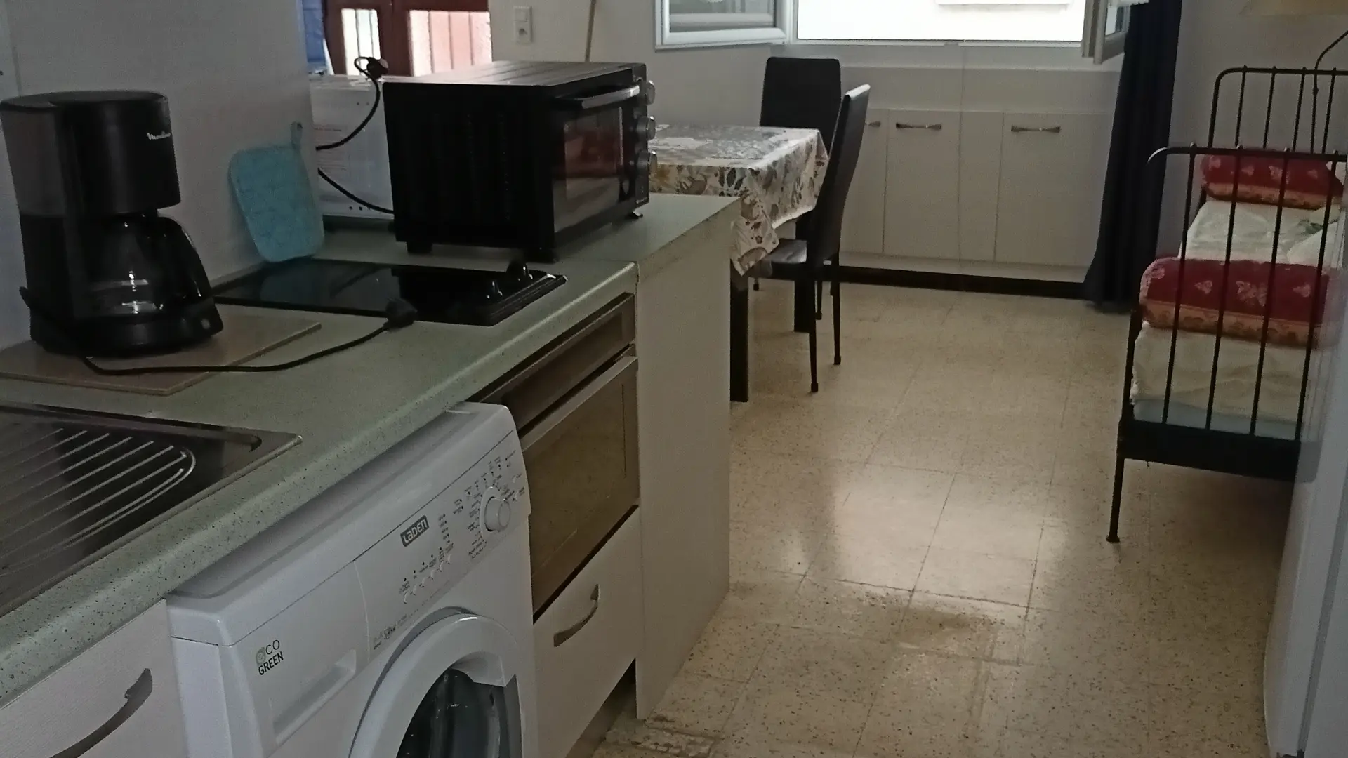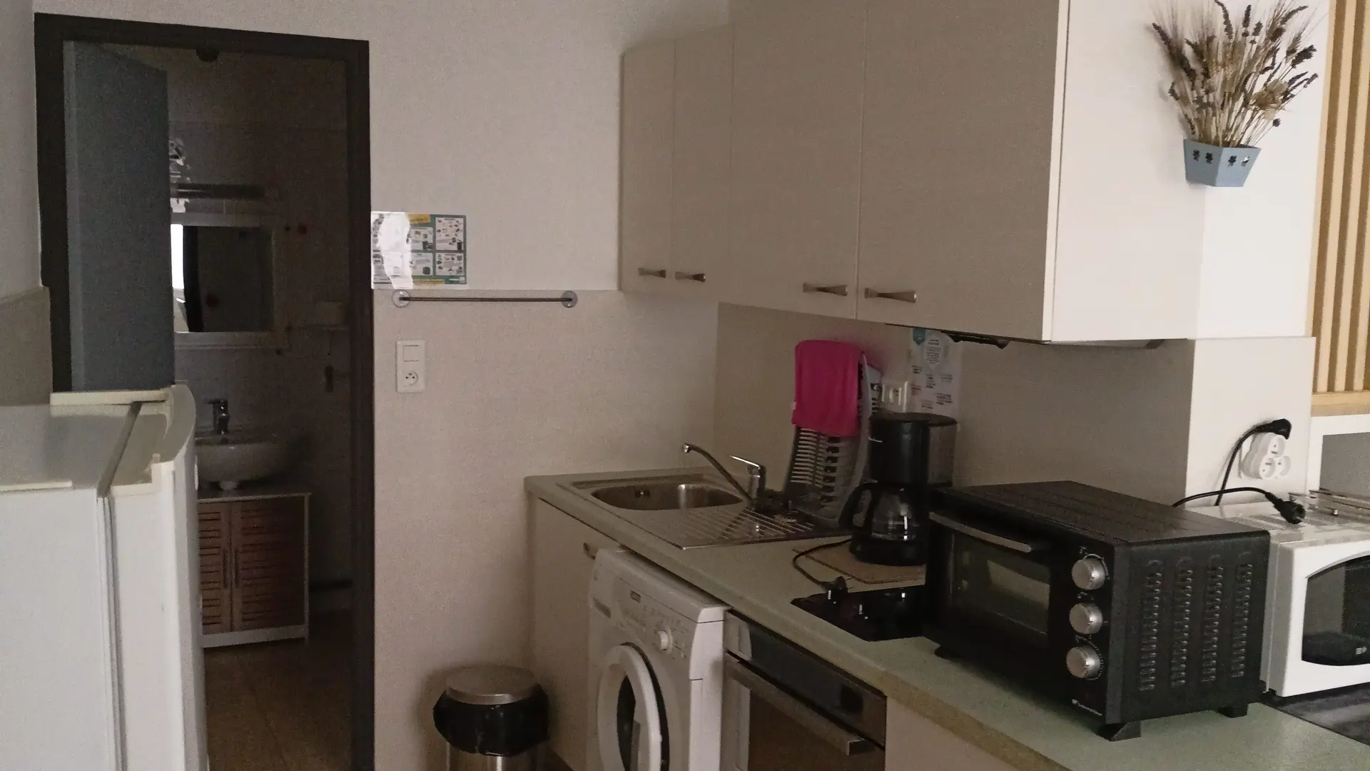 Cuisine équipée : four, micro-ondes, machine à laver, plaques vitrocéramiques, réfrigérateur/congélateur,