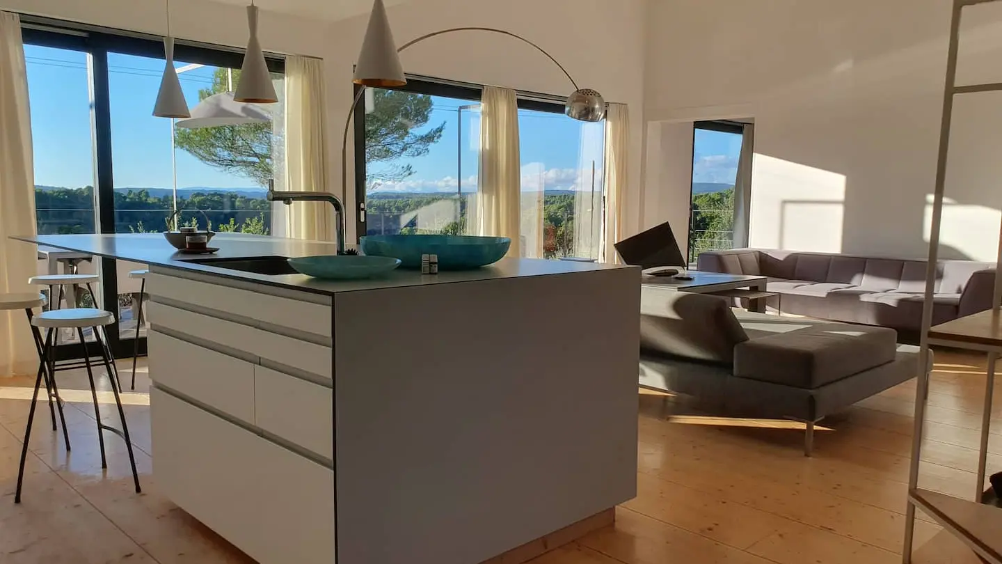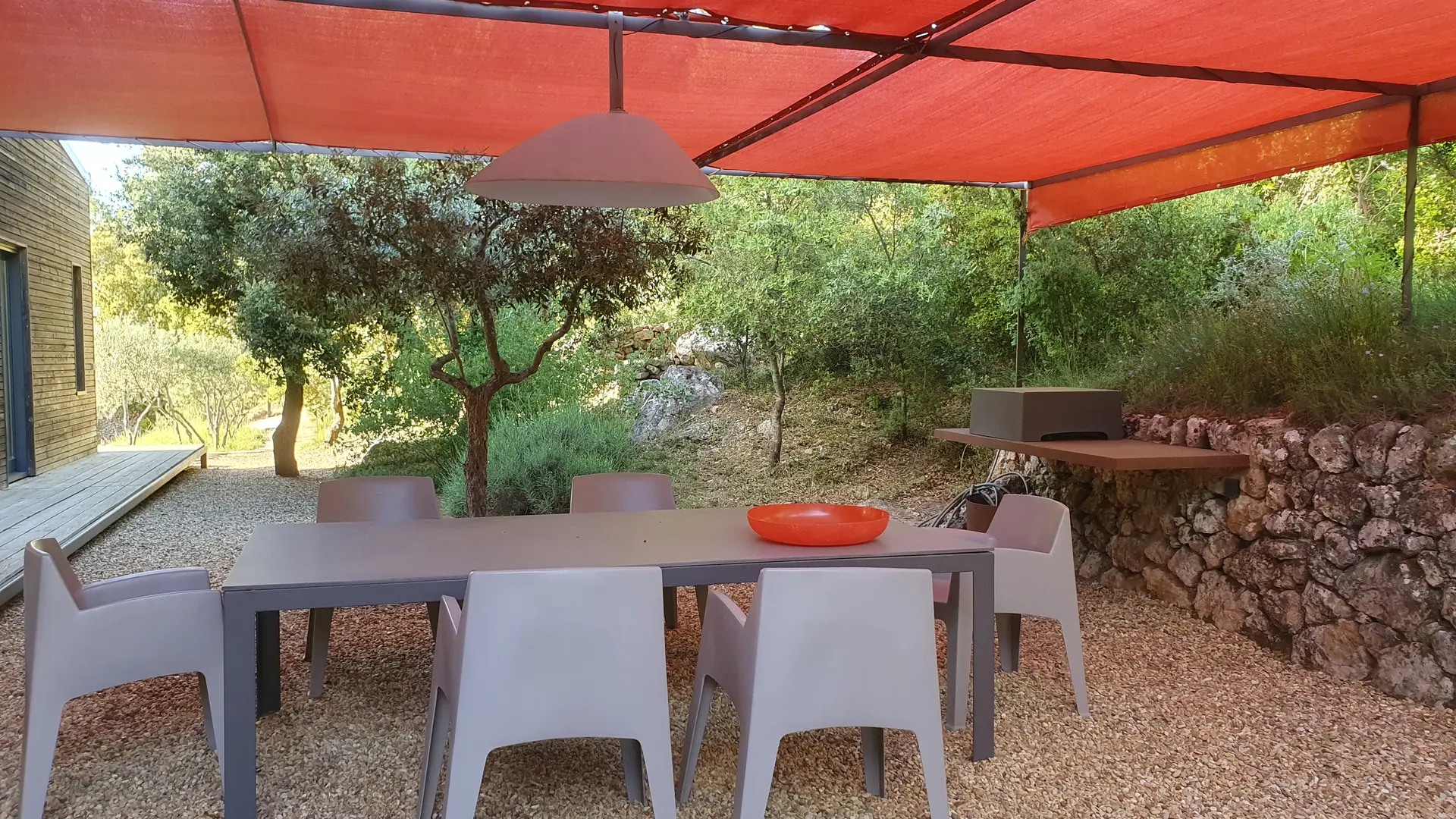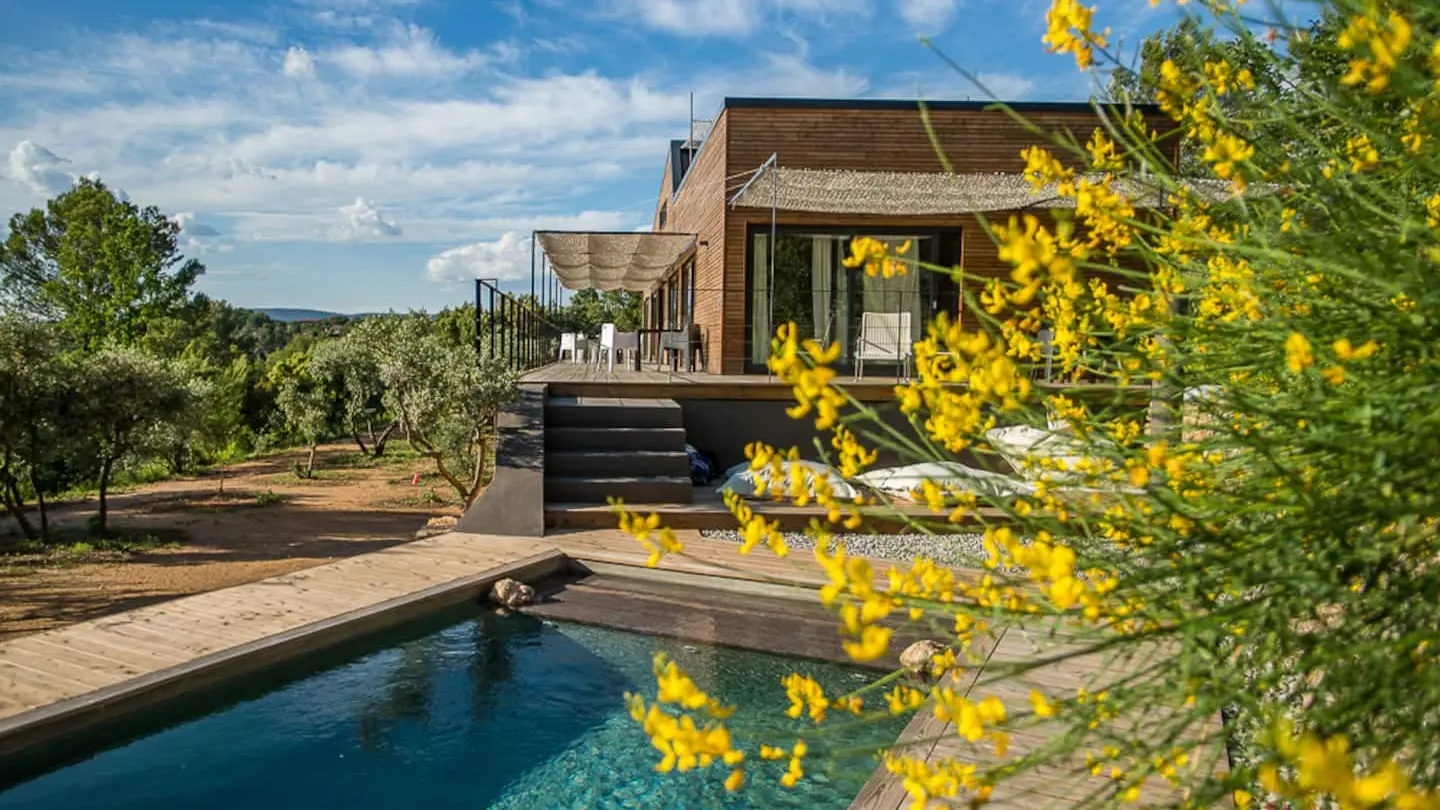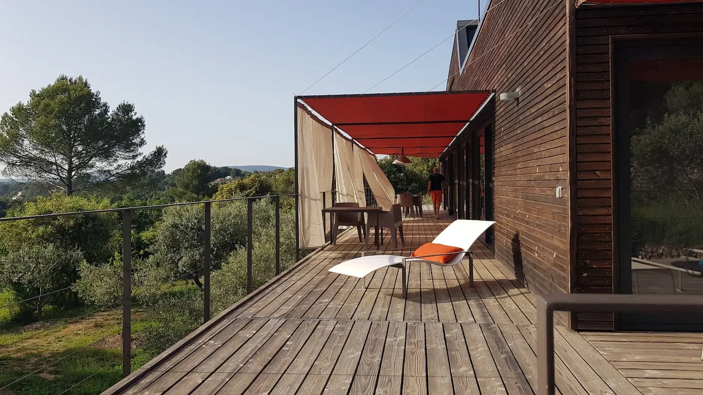 Spacieuse maison contemporaine écologique en bois de 160 m². Décor et confort soignés. Vue dominante sur restanques d'oliviers et collines environnantes. Paradis des cigales et des amateurs de tranquillité. À environ 800m du village de Pontevès.