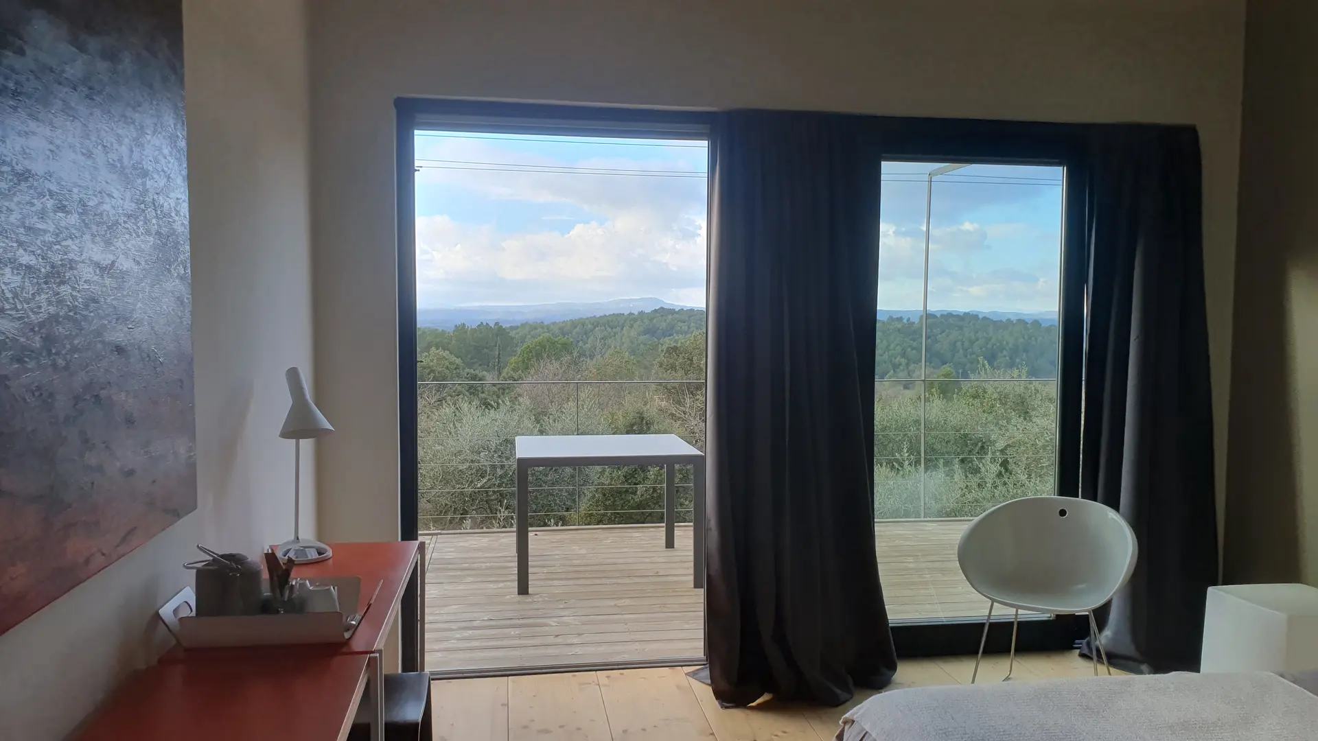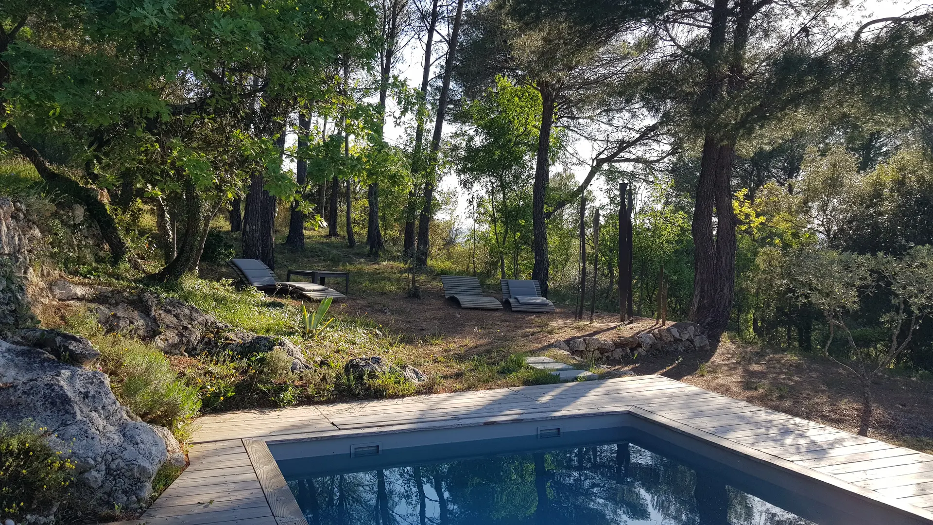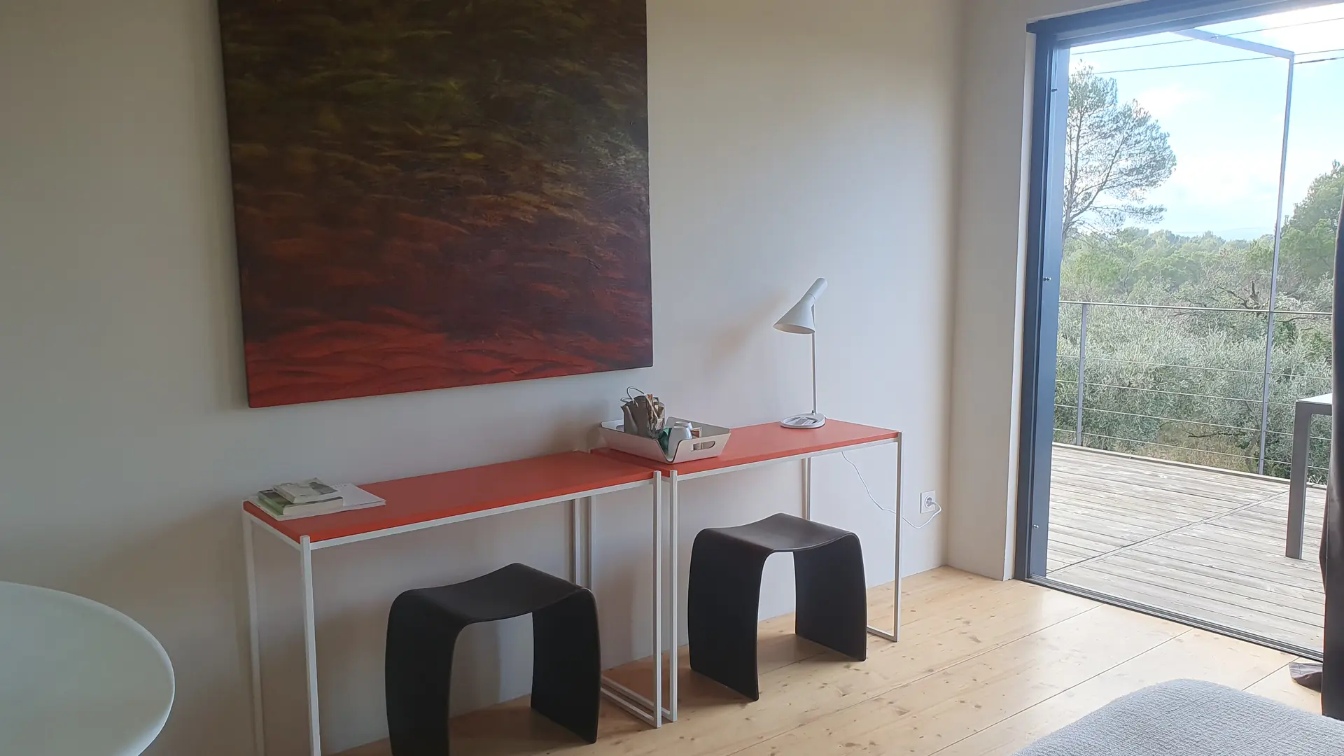 Spacieuse maison contemporaine écologique en bois de 160 m². Décor et confort soignés. Vue dominante sur restanques d'oliviers et collines environnantes. Paradis des cigales et des amateurs de tranquillité. À environ 800m du village de Pontevès.