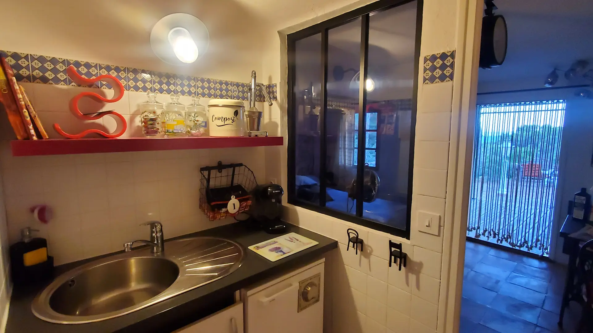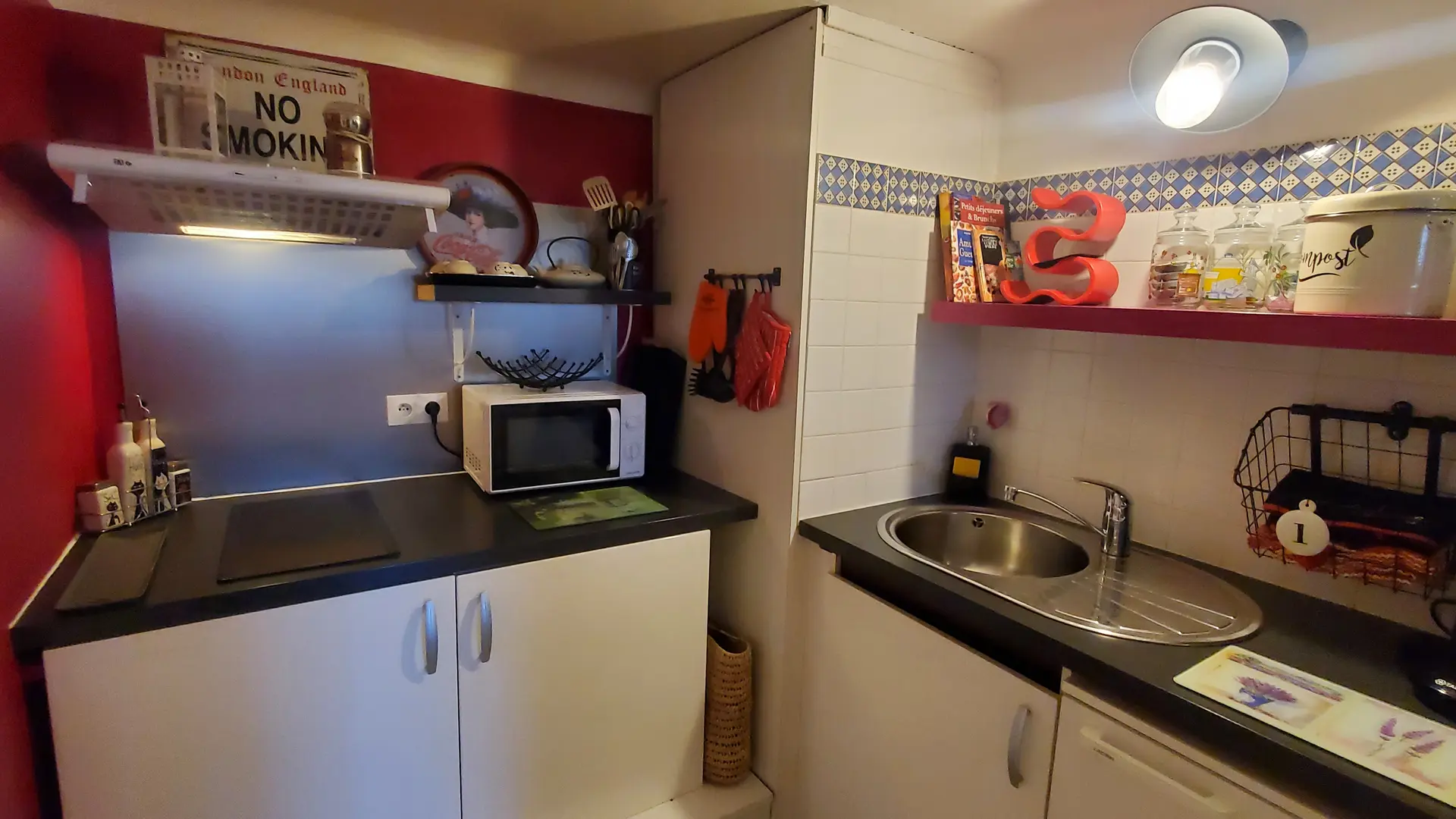 Il se compose : d'une grande pièce à vivre avec un coin repas, une cuisine séparée entièrement équipée (une plaque de cuisson à induction, une hotte, un réfrigérateur, un micro onde, un four, une cafetière, un grille-pain et la toute la vaisselle nécessaire sont à votre disposition), un coin nuit avec un lit de 160 x 200, une salle d'eau, WC.