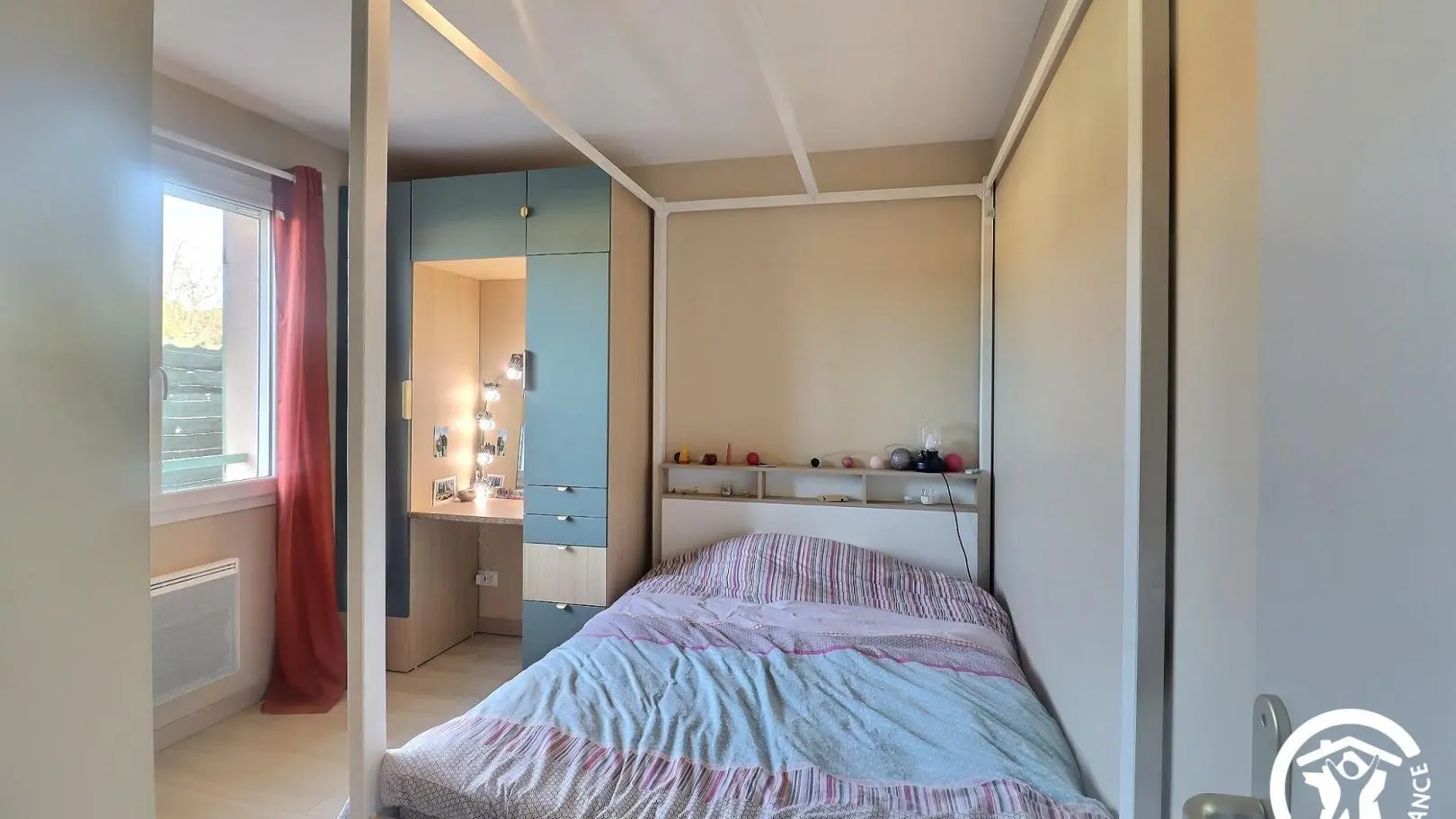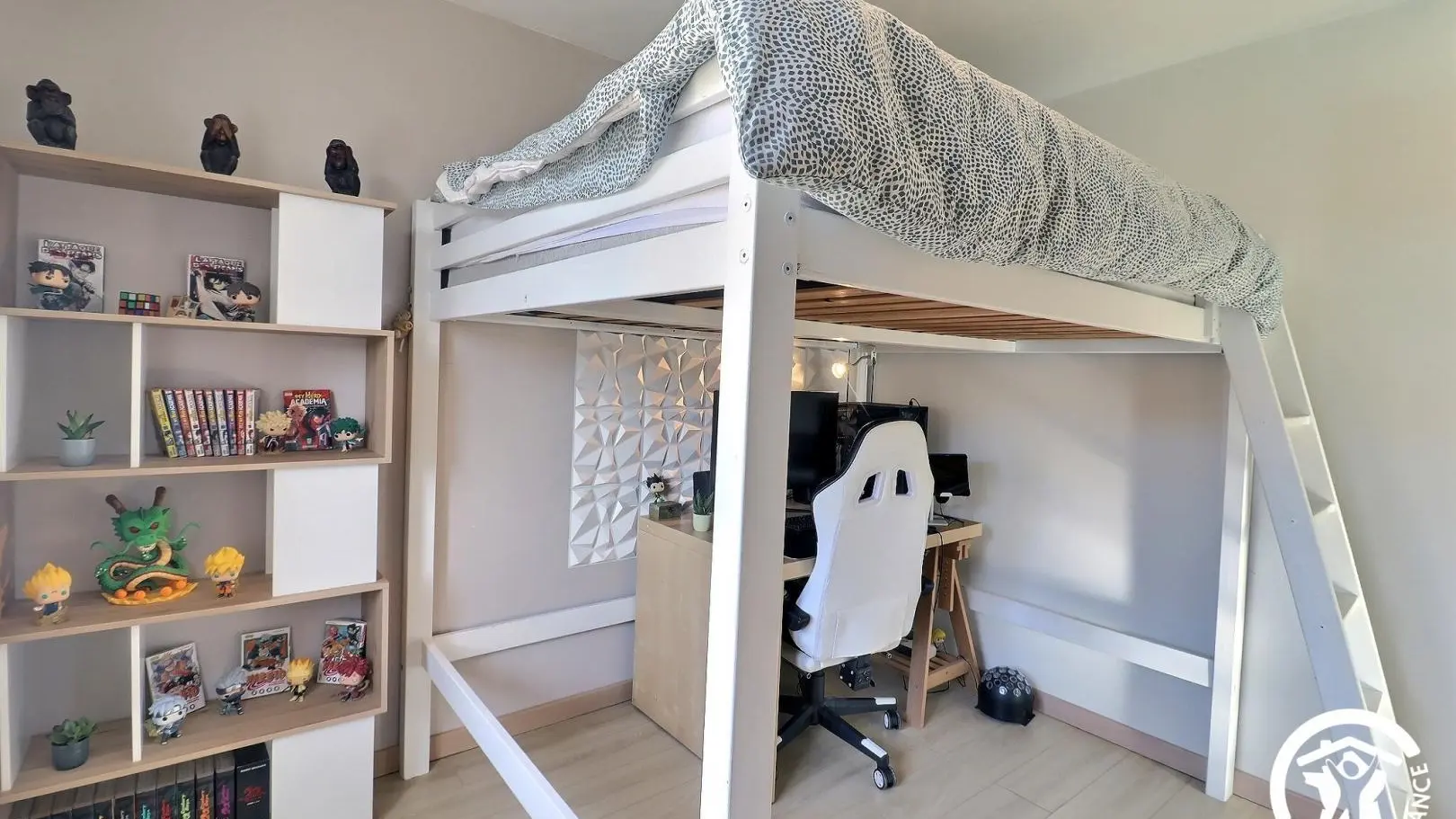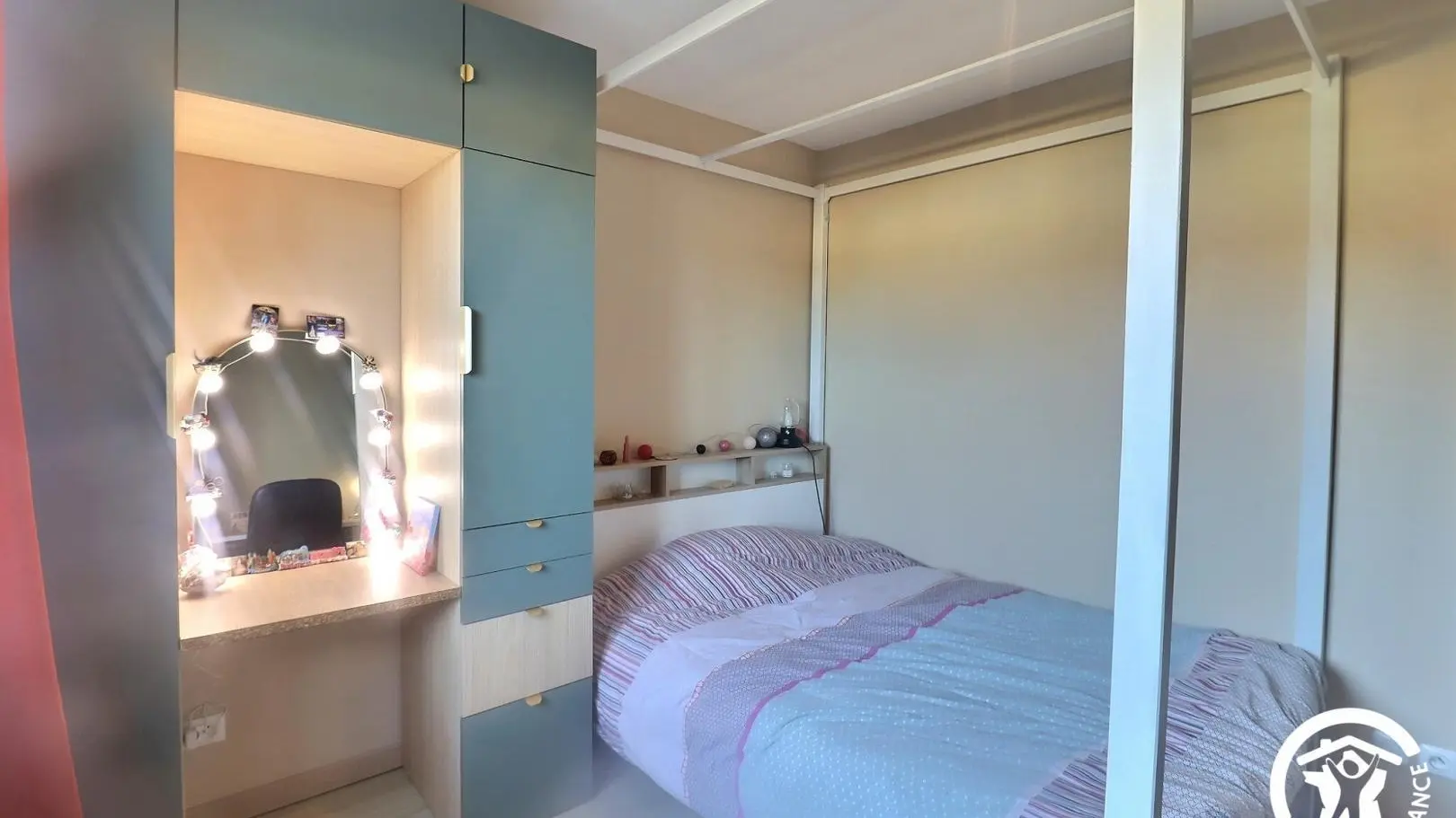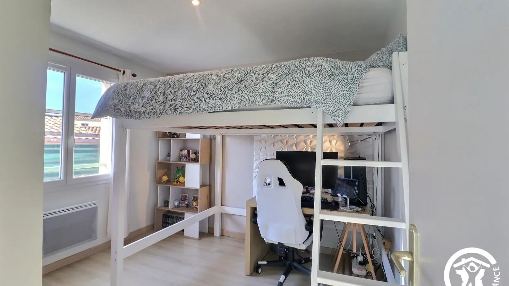 - 2 chambres avec lits doubles (1 lit baldaquin 140x190cm et 1 lit 160x200cm en mezzanine), placards et bureaux.