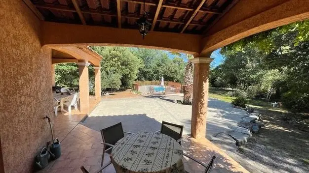 Grande terrasse avec vue sur la piscine (4 m x 7 m), de la place pour bouger et pour se reposer.