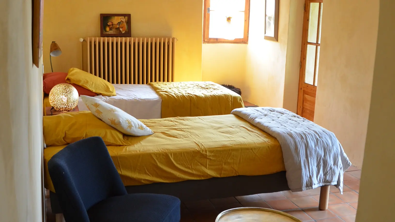 Chambres pour 2 à 3 personnes avec petit-déjeuner bio, local. Possibilité d’ajouter un lit supplémentaire.
