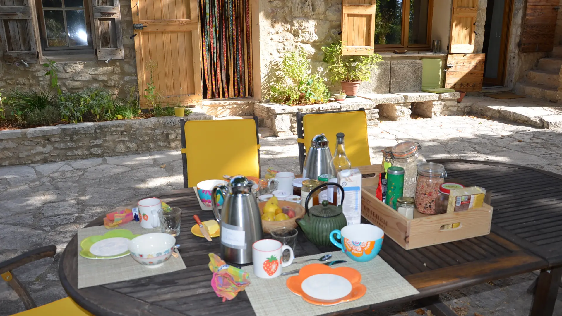 Table d’hôtes avec les produits bio cultivés sur le Domaine, à partir de quatre personne, sur réservation.