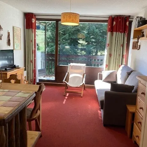Appartement 2 personnes. Coin Montagne. 28m² avec balcon, baignoire, WC indépendant, coin cuisine équipée : four combiné microondes, plaques vitro céramique, frigo, grille pain, bouilloire, appareil à raclette, vaisselle pour 6 personnes, télévision, lecteur dvd, clic clac, siège bébé, 3 lits superposés dans coin montagne.