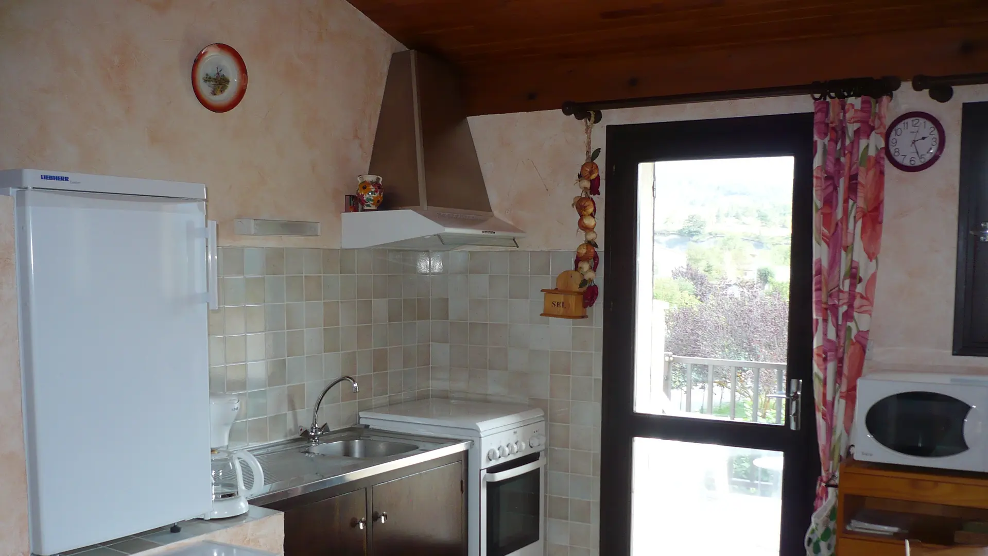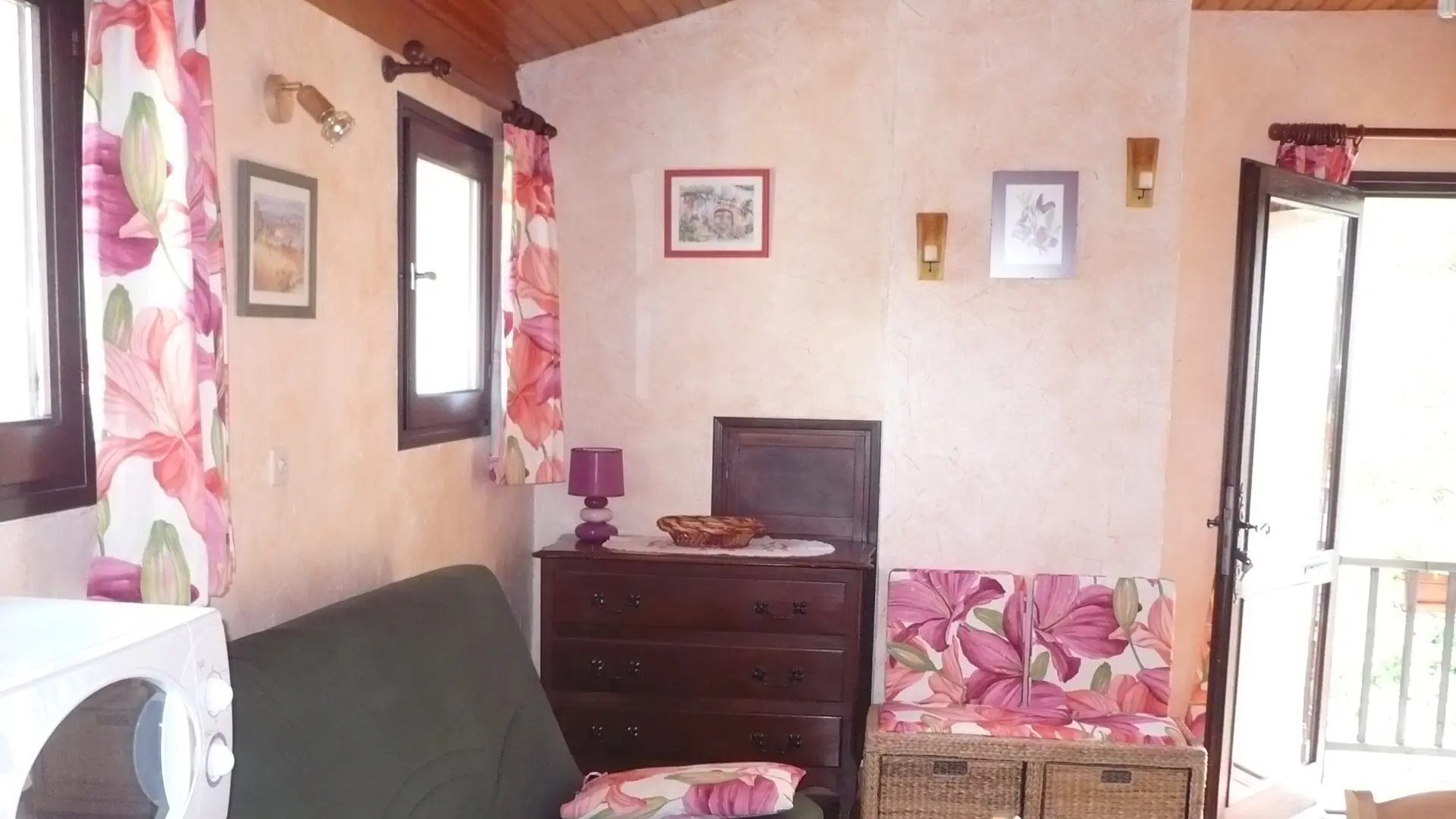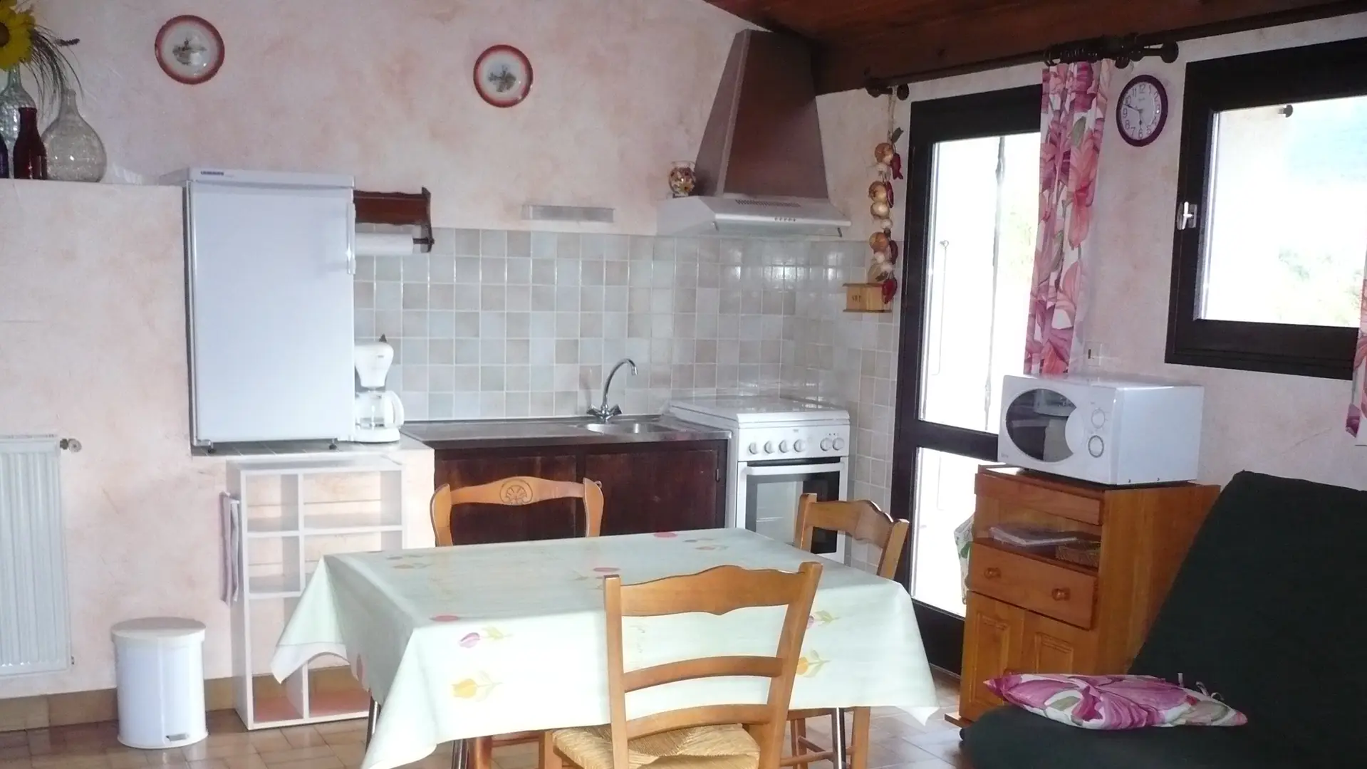 - 1 séjour avec coin cuisine et coin salon comprenant un canapé convertible 2 places