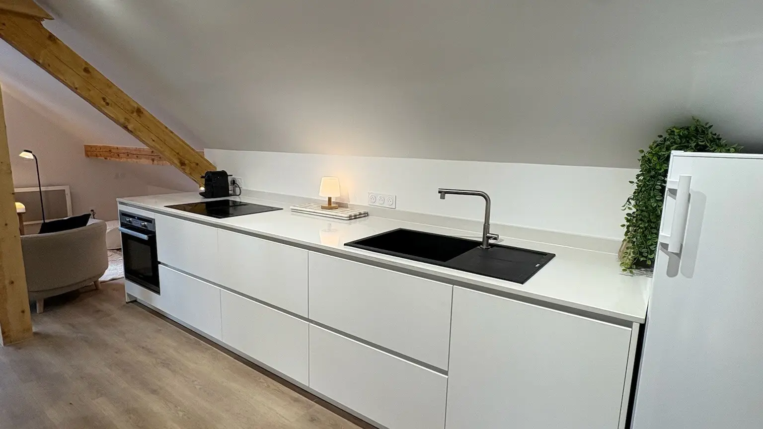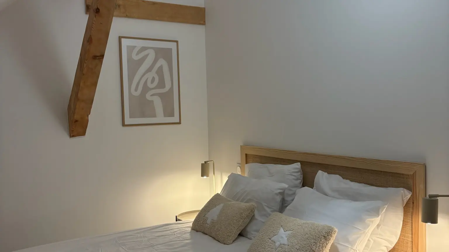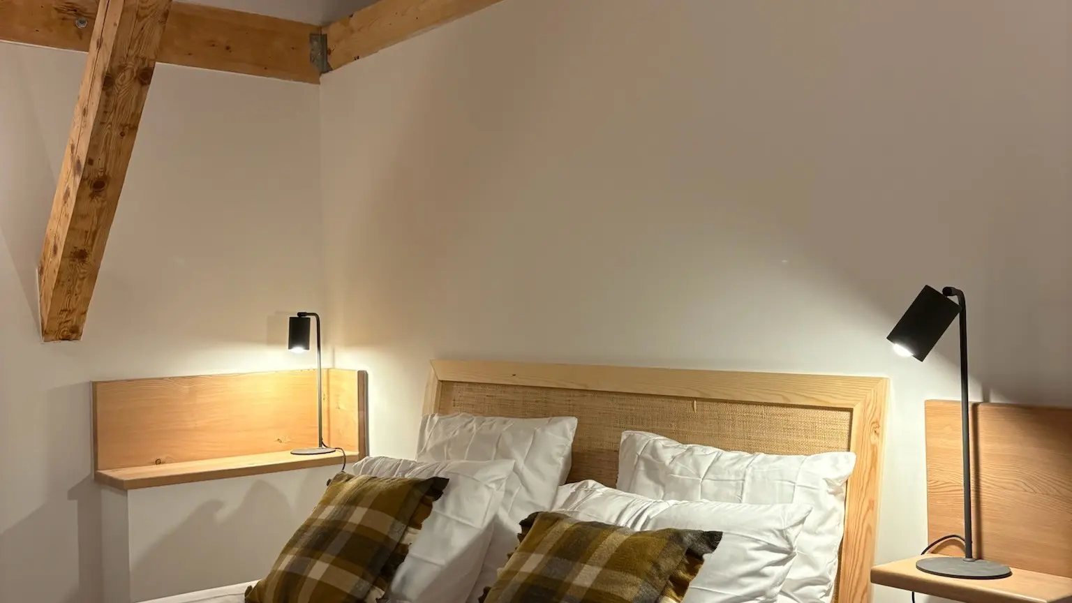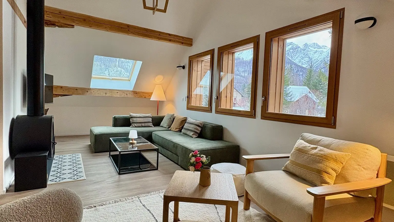 Cet appartement neuf de 95 m², doté de trois chambres, offre un espace de vie chaleureux et contemporain sous les toits, avec un salon lumineux agrémenté d’un poêle à bois.