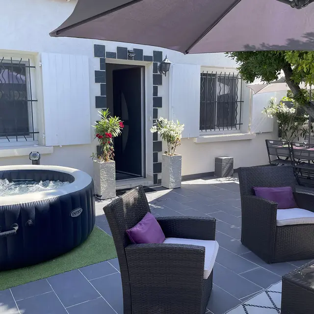 Quartier Bellevue, villa T2 climatisée indépendante de 45m² de 2 pièces pour 2 adultes 2 enfants. Son atout : extérieur de 47 m² au calme, sans vis à vis avec salon de jardin, salon repas, barbecue weber, transats, jacuzzi . TV écran plat, wifi, parking, lave-linge. Option location linge de lit et serviette.