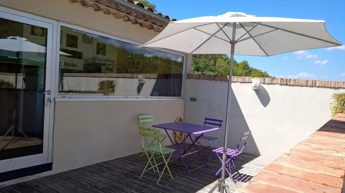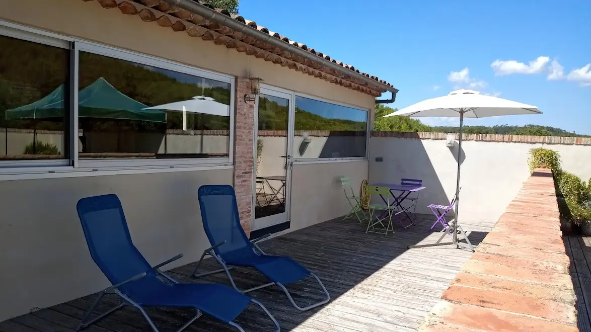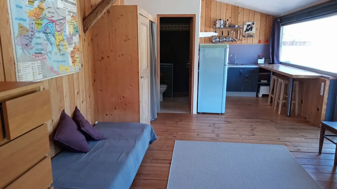 Le Cabanon est réalisé avec le charme de l'ancien, exposition Nord-Est, avec son intérieur bois et ses grandes baies vitrées, ses lits confortables, sa terrasse privative de 30 m² en bois et sa vue panoramique sur la piscine et la forêt & le quartier très calme.