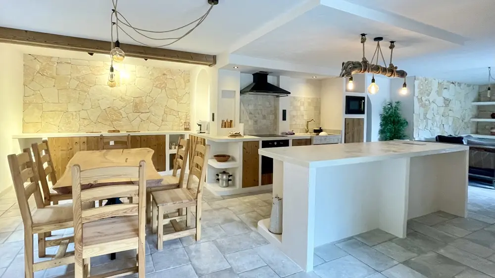 • Une grande pièce de vie avec cuisine ouverte avec grand ilot central, salle à manger et salon avec canapé convertible