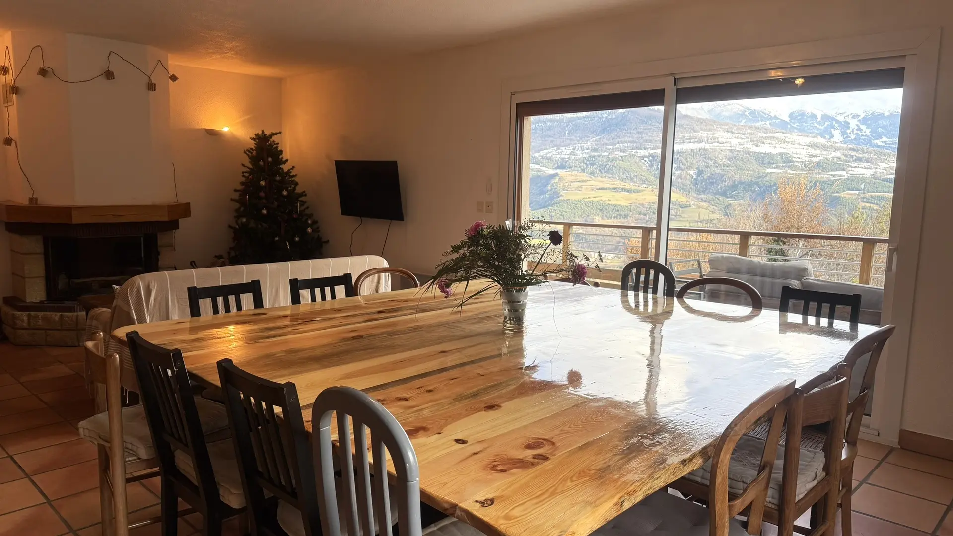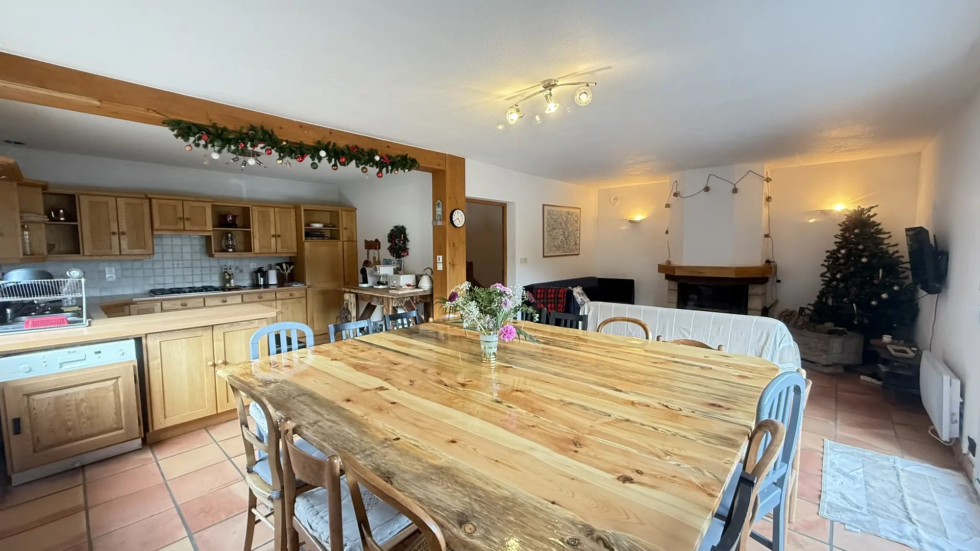 • Un salon et salle à manger avec une table de 16 couverts et une cheminée rustique