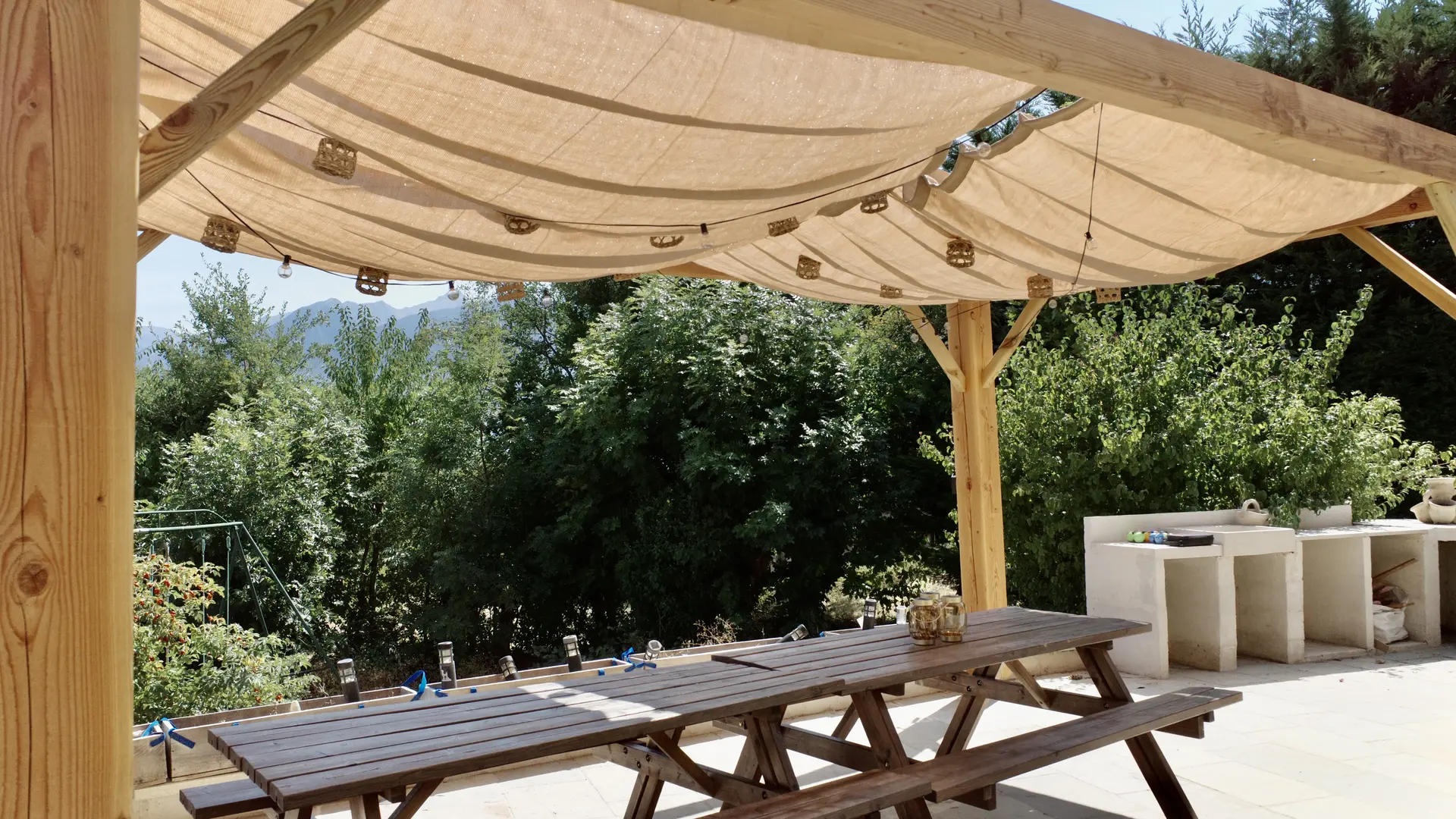 • Un espace repas en plein air avec grandes tables