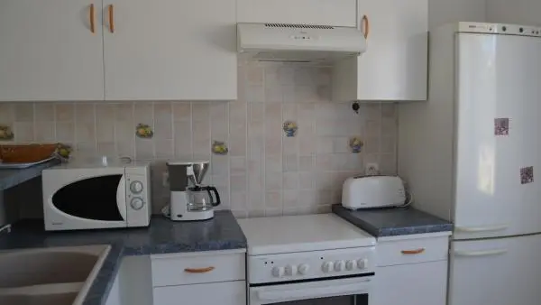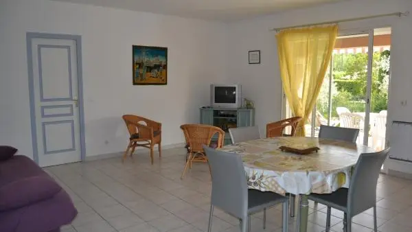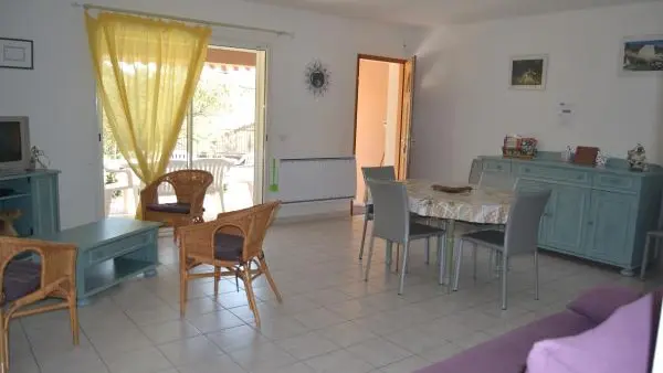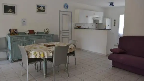 Jolie décoration, de qualité : séjour-salon, canapé clic-clac 2 p., coin cuisine américaine équipée. 2 ch 1 lit 2 p., 2 lits 1 p. Salle d'eau, douche. Wc. Lit + table à langer + chaise haute bébé. Location draps 10€/lit. ménage fin de séjour sur demande 60€. Forfait chauffage : 50€/s. Taxe séjour incluse. WiFi, garage pour vélos et voiture.