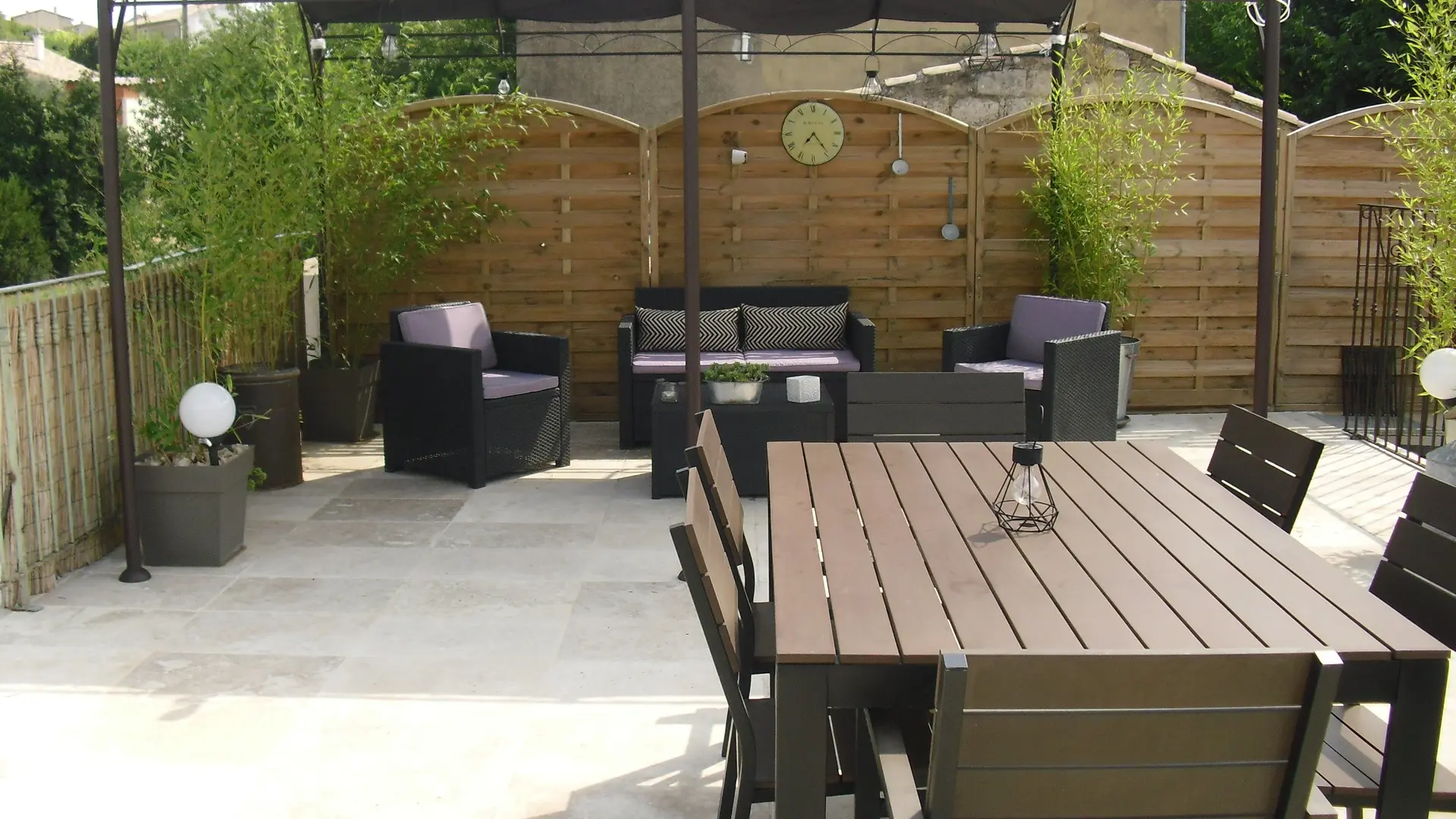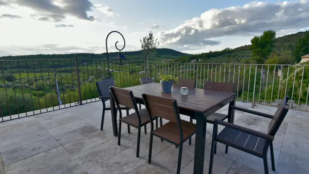 deux grandes terrasses privatives dont une panoramique de 45m2 orienté soleil couchant sur la campagne et le village perché de Blauvac avec barbecue.