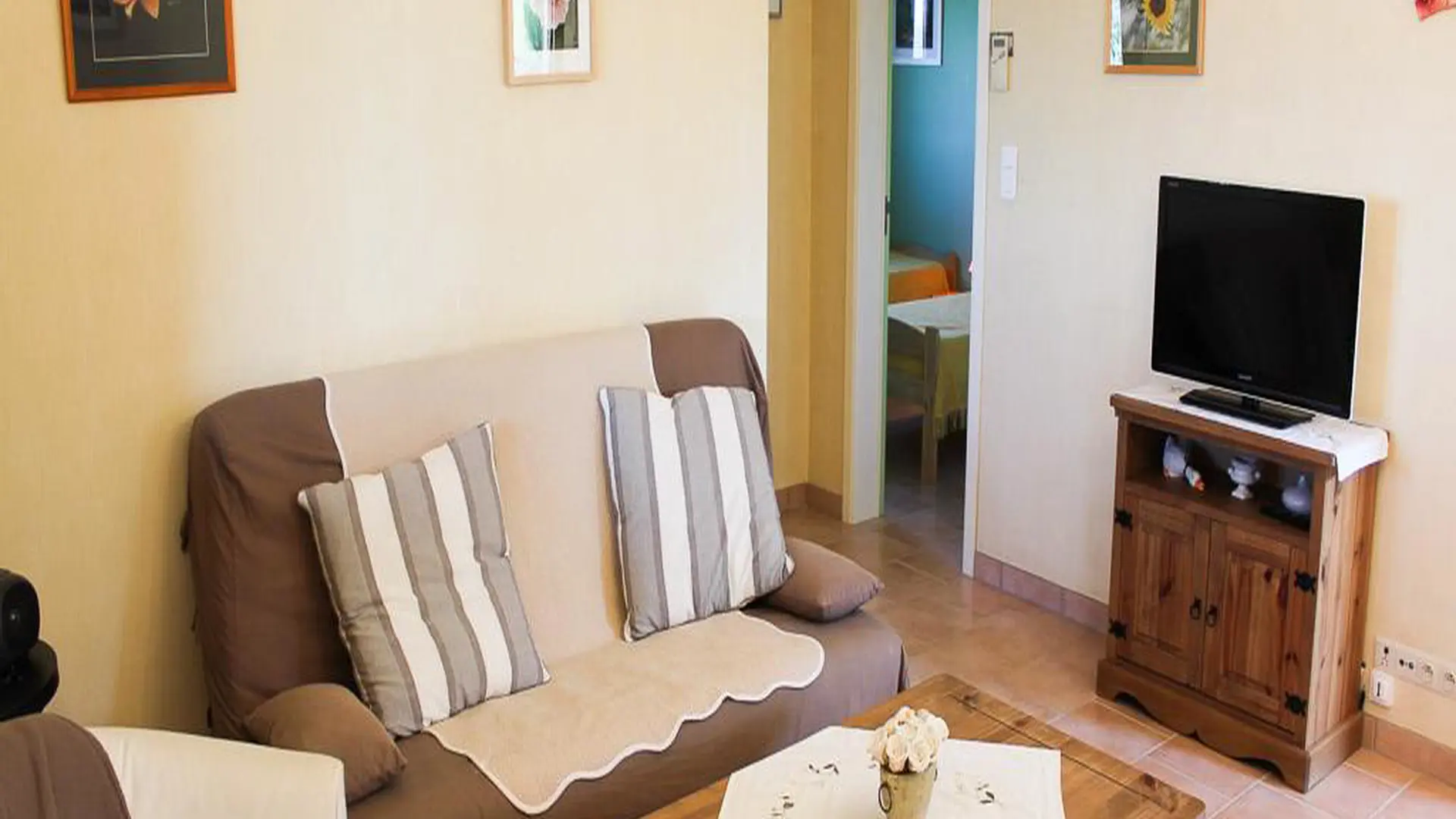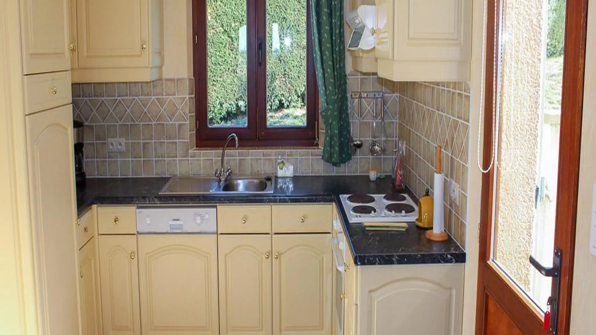 Rez-de-chaussée surélevé : Belle pièce à vivre comprenant une cuisine ouverte équipée (plaque de cuisson électrique, four, micro-ondes, lave-vaisselle, machine à café, bouilloire), d'une salle à manger et un espace détente avec canapé, télévision à écran plat, Wi-Fi Un cellier, un WC indépendant avec lave-mains complètent cet espace.