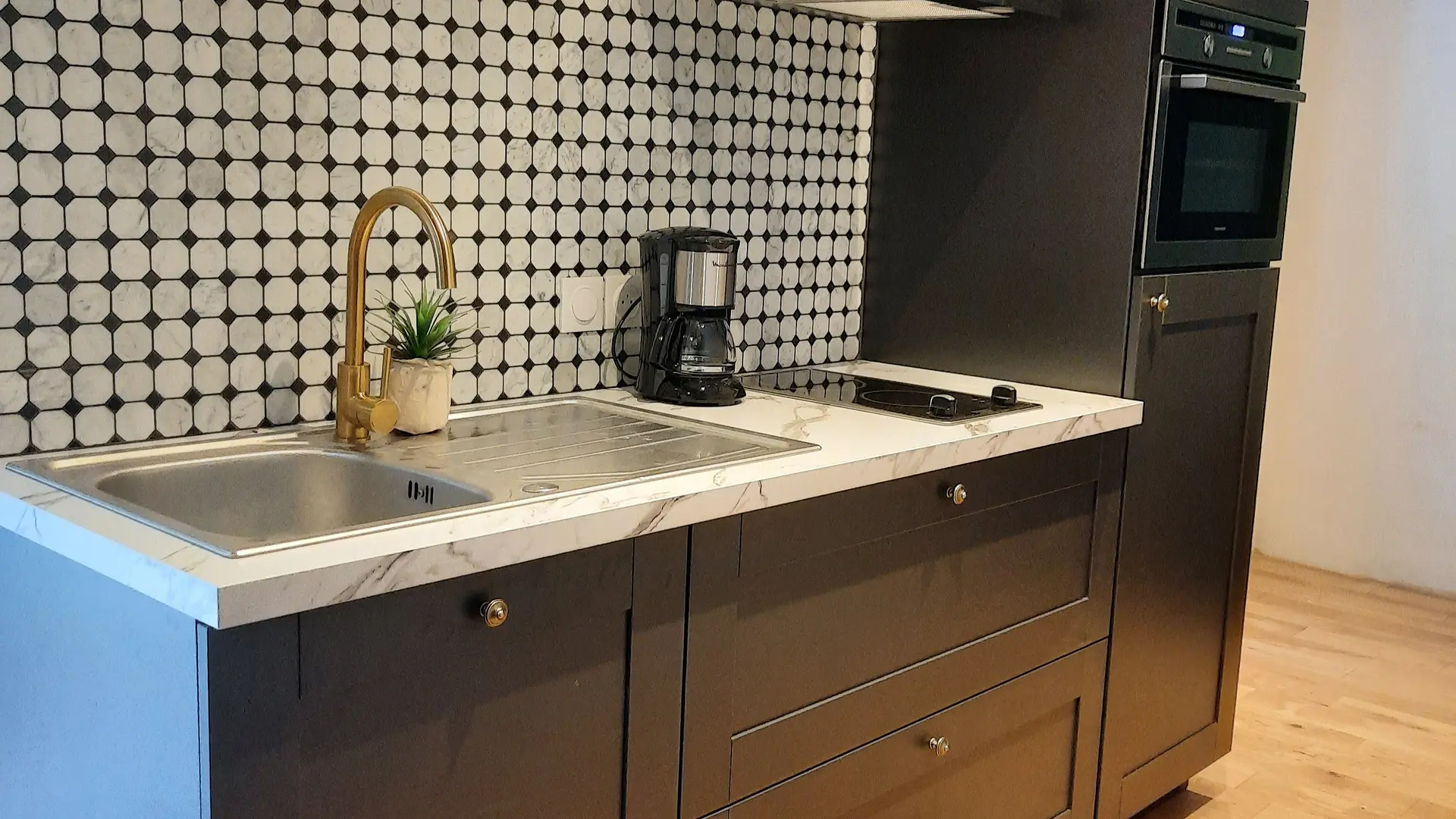 - un coin cuisine équipé - une pièce à vivre salon/salle à manger