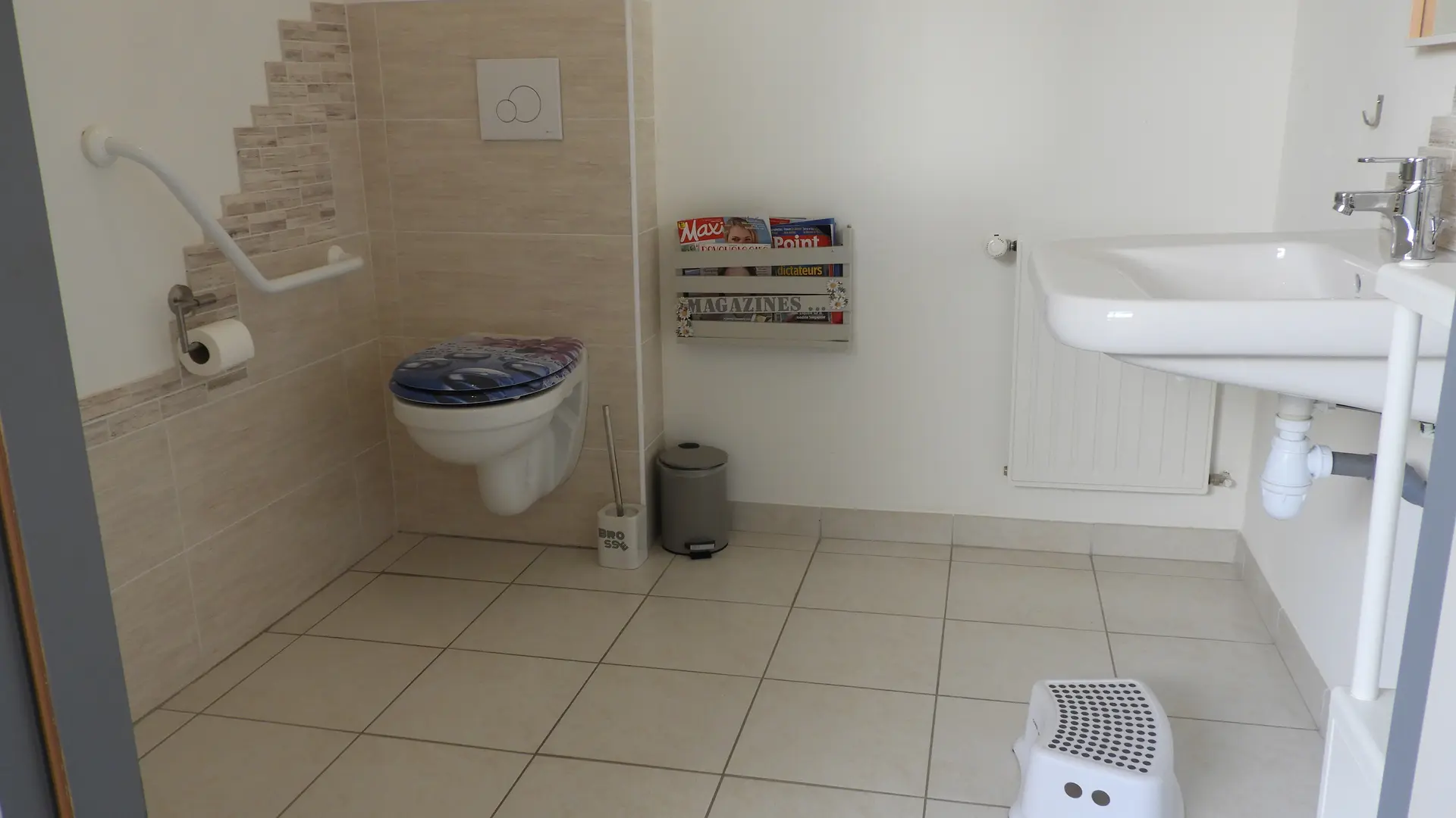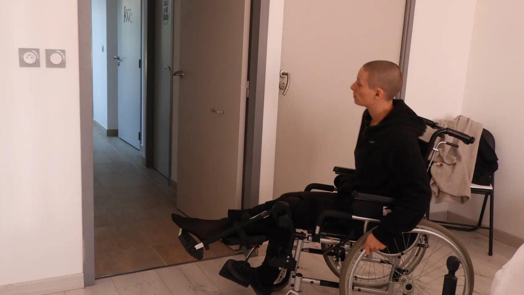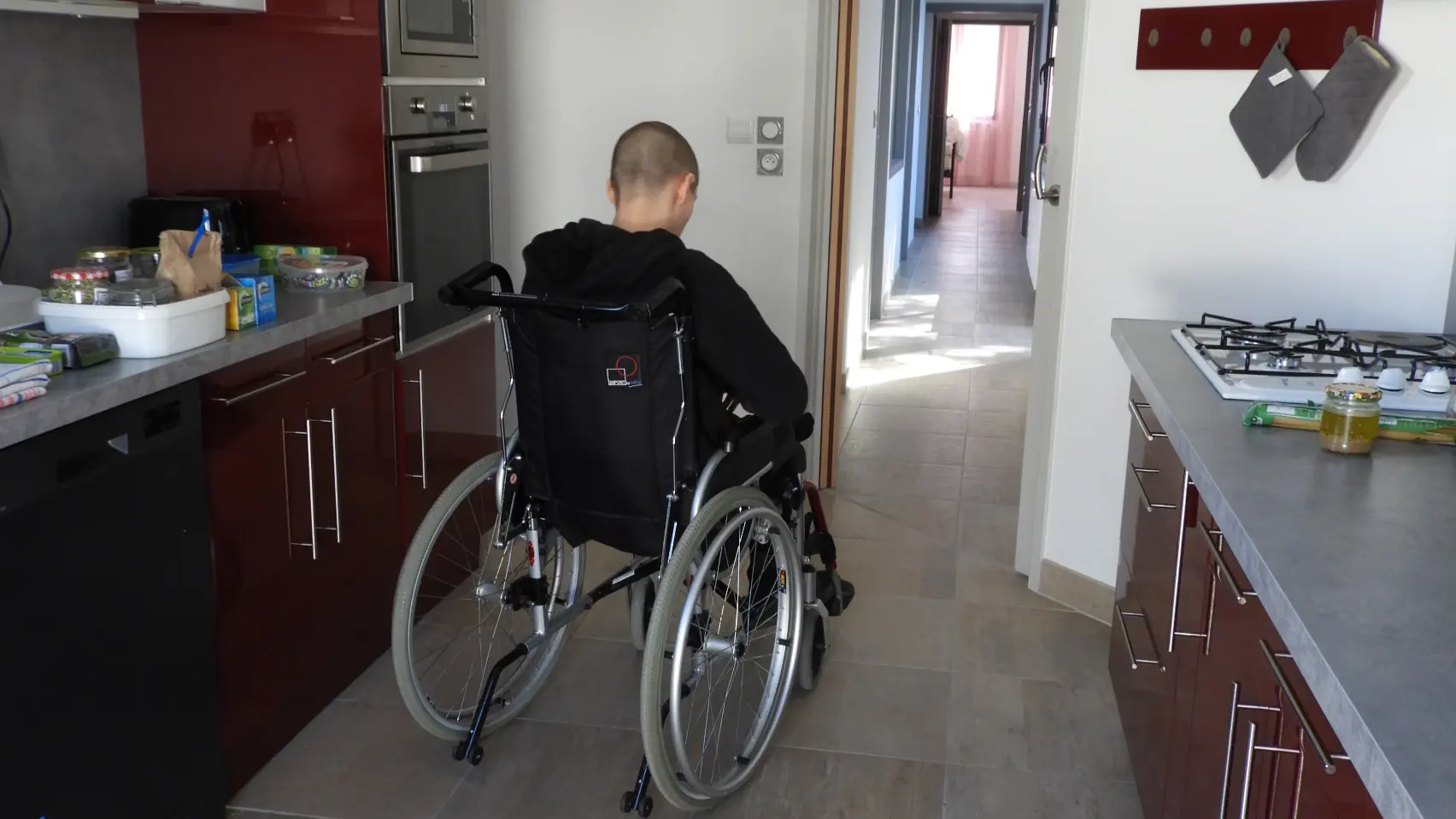 Maison de plain pied, chambre et salle d'eau conçues pour une personne en situation de handicap (douche à l'italienne, siège de douche, largeur de porte compatible avec un fauteuil, aucun ressaut, aire de retournement de 1.50m dans la chambre) cuisine et terrasse bois accessibles pour un fauteuil
