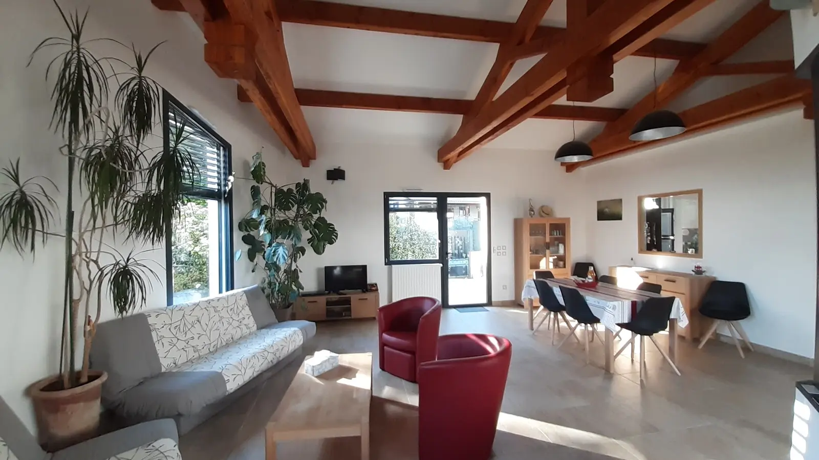 Espace à vivre de 67 m² (salon, salle à manger, jardin, patio).
