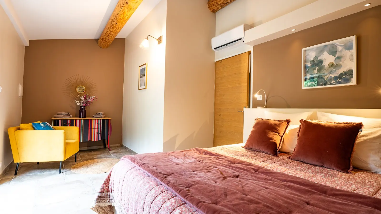 La chambre parentale d'une belle taille avec son mur de pierres et son éclairage tamisé, est un véritable appel au farniente. Il est aussi très agréable de s'installer dans un transat de la terrasse pour lire ou se détendre.