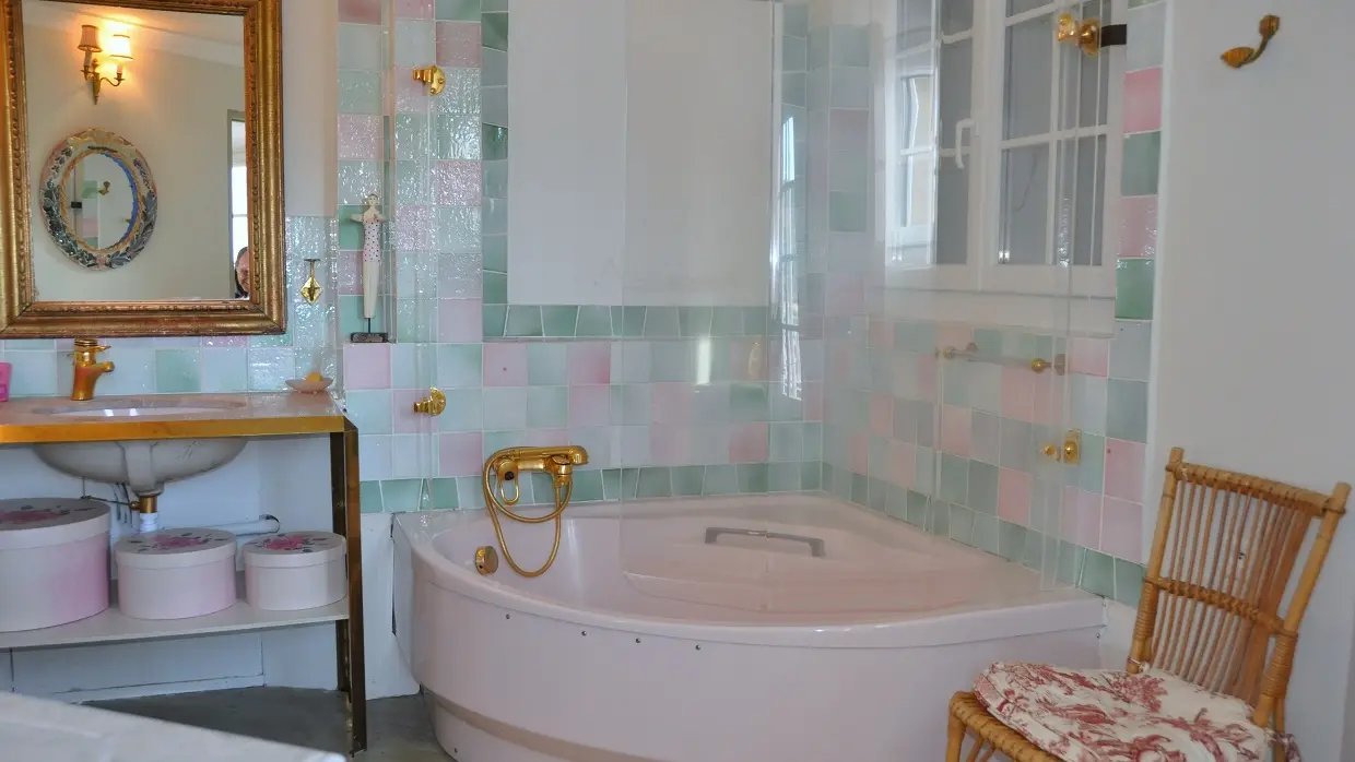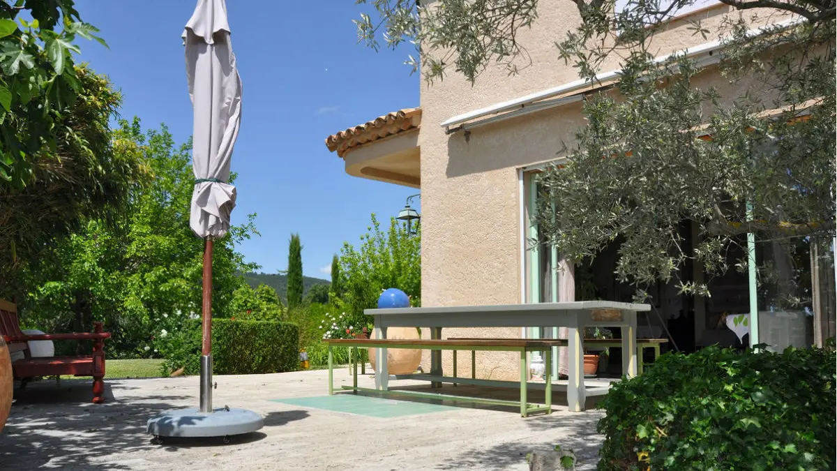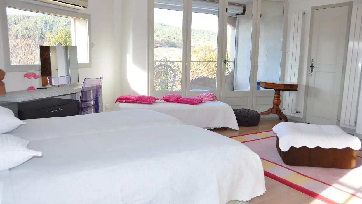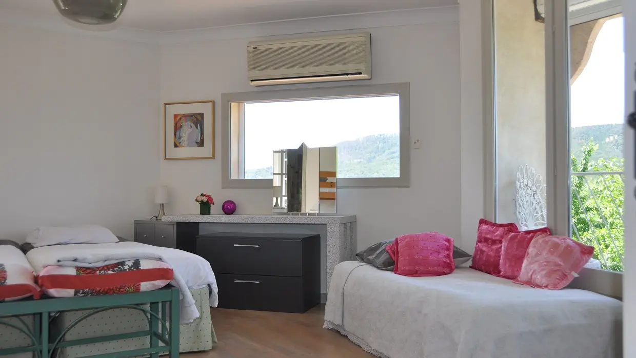 Une chambre familiale à l'étage de 45 m2, avec salle de bains, dressing, WC , 5 lits indépendants de 90 cm , climatisation. parking, jardin accès piscine.