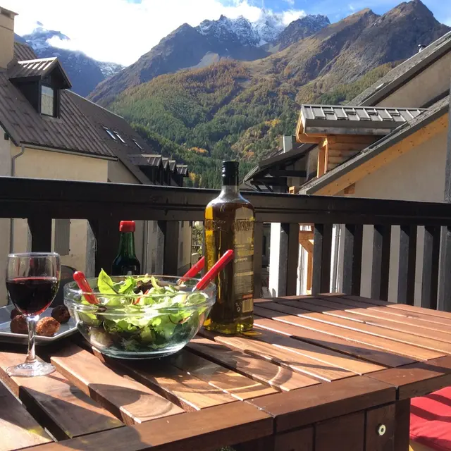Le balcon orienté sud donne sur le Parc national des Écrins.