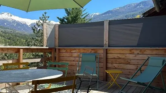À l'étage, une grande chambre avec un lit en 160 cm et un lit en 90 cm. Au rez-de-chaussée, une cuisine entièrement équipée, un salon avec un canapé-lit pour 2 personnes, une chambre avec 2 lits en 90 cm, une salle de bains, des toilettes séparées et une grande terrasse avec vue sur les montagnes.