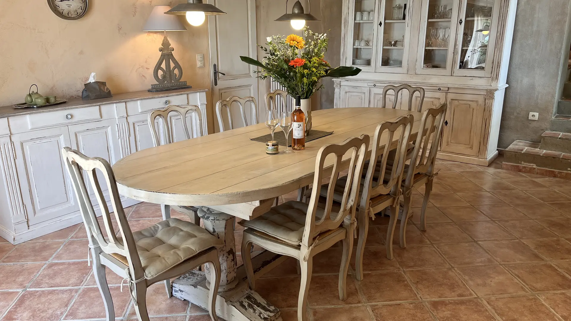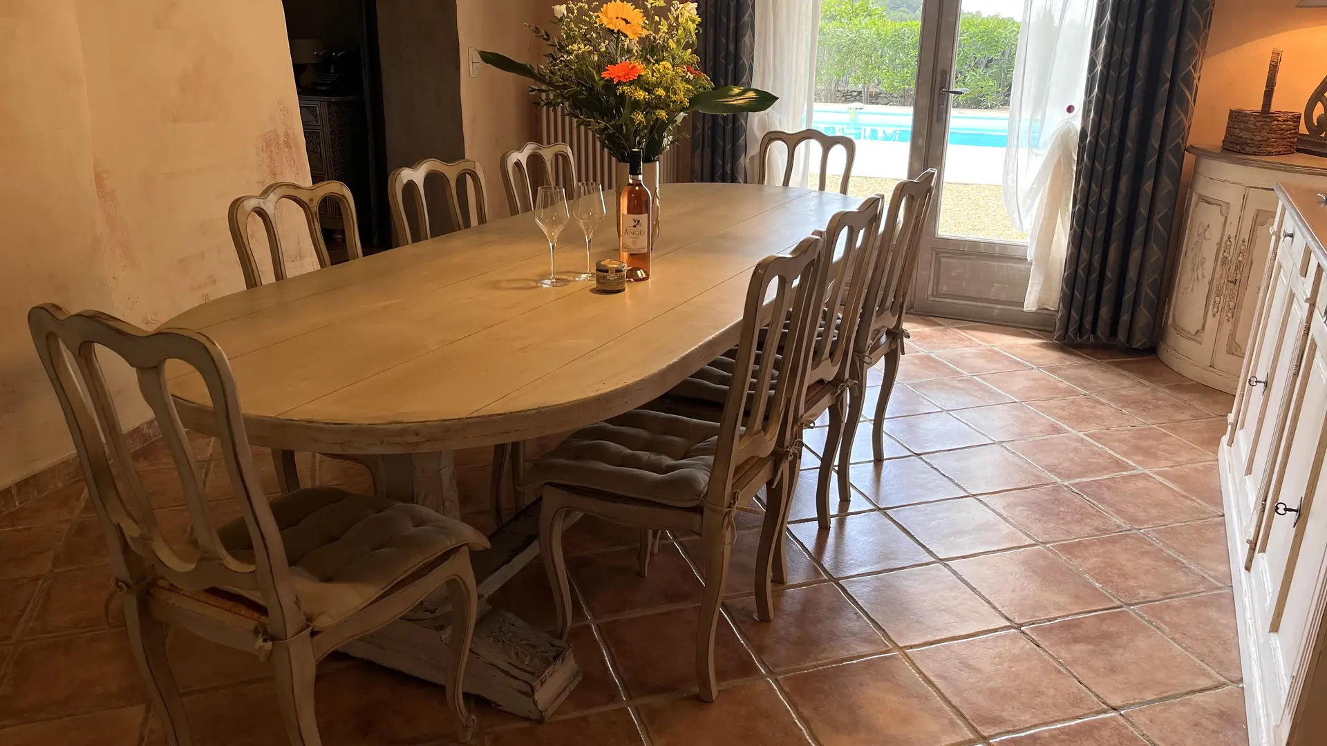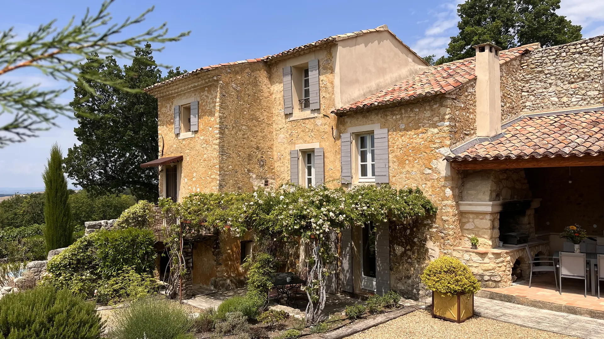 Mas authentique au charme d'antan et aux prestations soignées. La maison de 180 m2 avec son jardin de 1.573 m2 est située en pleine nature au pied du Mont Ventoux. La piscine surplombant les collines et les vignes vous accueille sous l'ombre du grand chêne de 700 ans. Les vues étendues inspirent tant le repos que les balades. Faites-vous plaisir avec des repas conviviaux sous la tonnelle ou autour de la plancha de la cuisine d'été ombragée. Détente et calme dans un cadre exceptionnel.