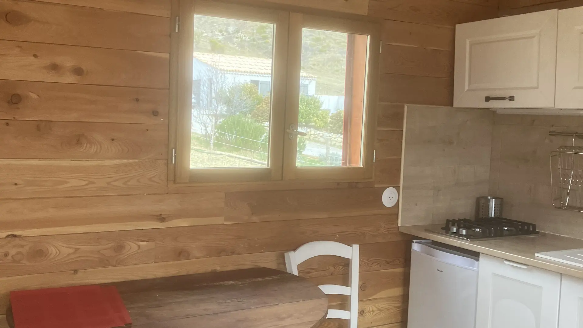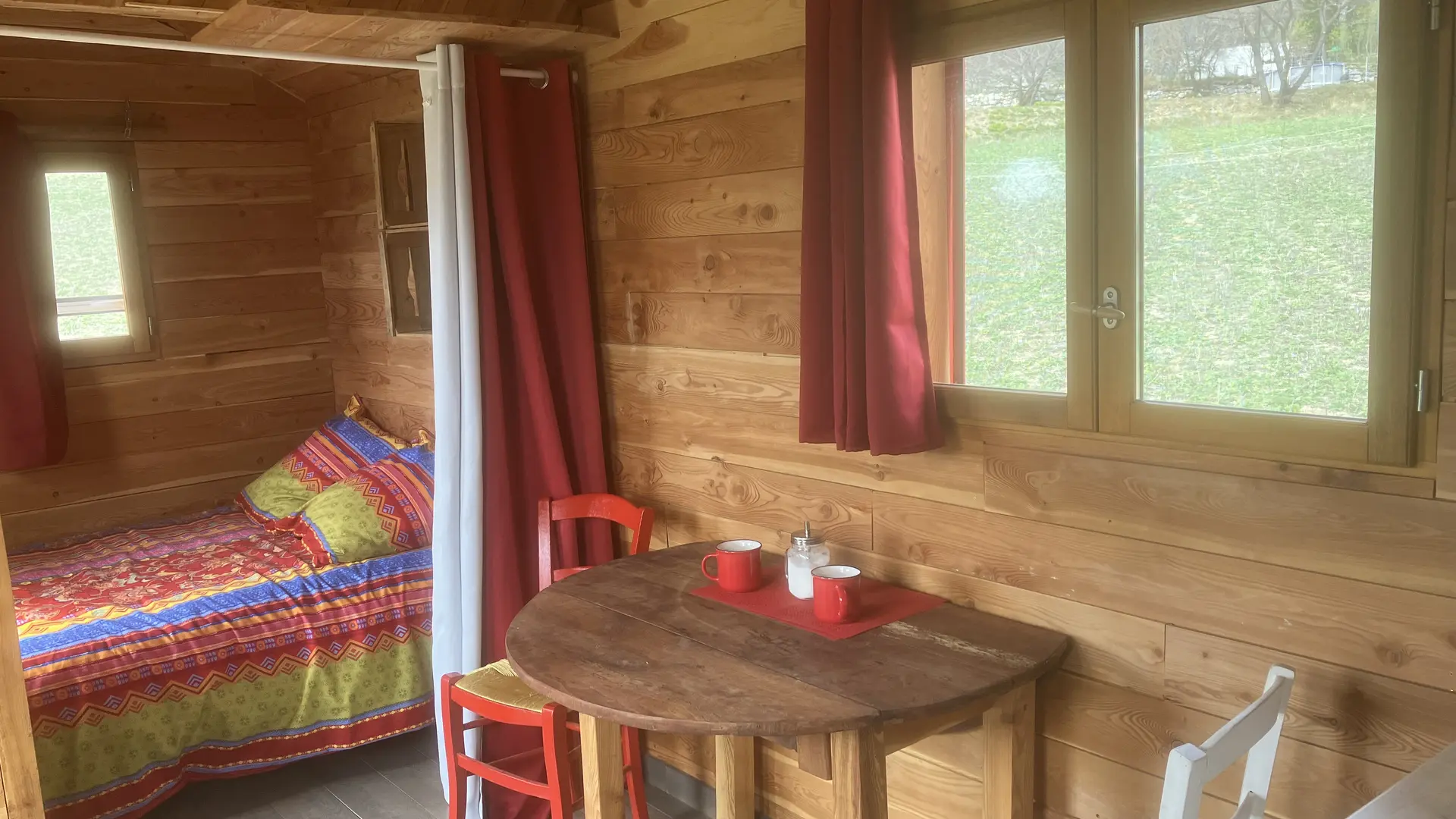 La roulotte est construite en bois de mélèze avec une isolation faite de laine de bois et un plancher en chêne. C'est un endroit idéal pour se ressourcer, se détendre, ou méditer.