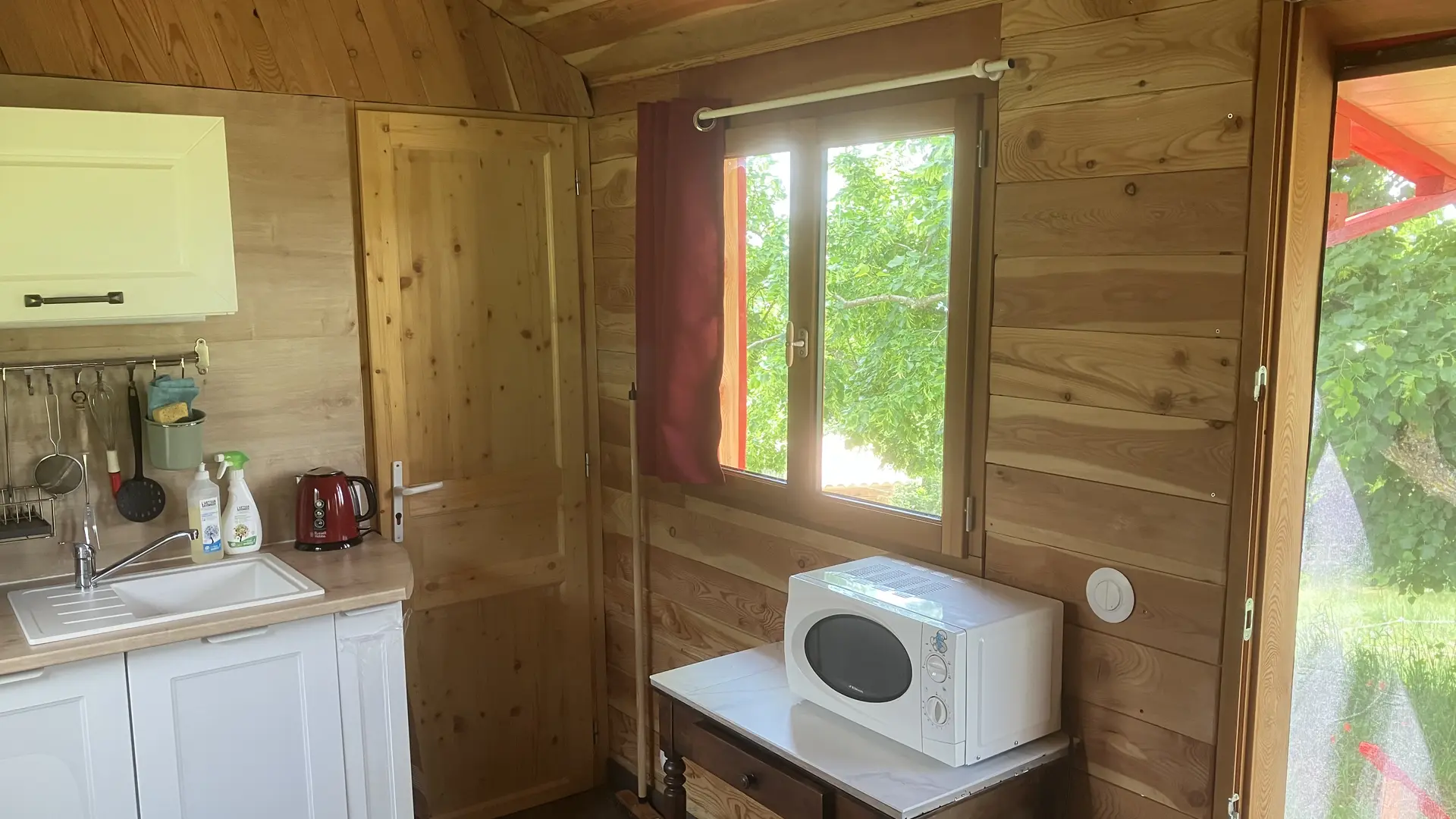La roulotte est équipé de toilettes sèches, d'une ventilation naturelle et d'eau de source pour l'arrosage des abords.