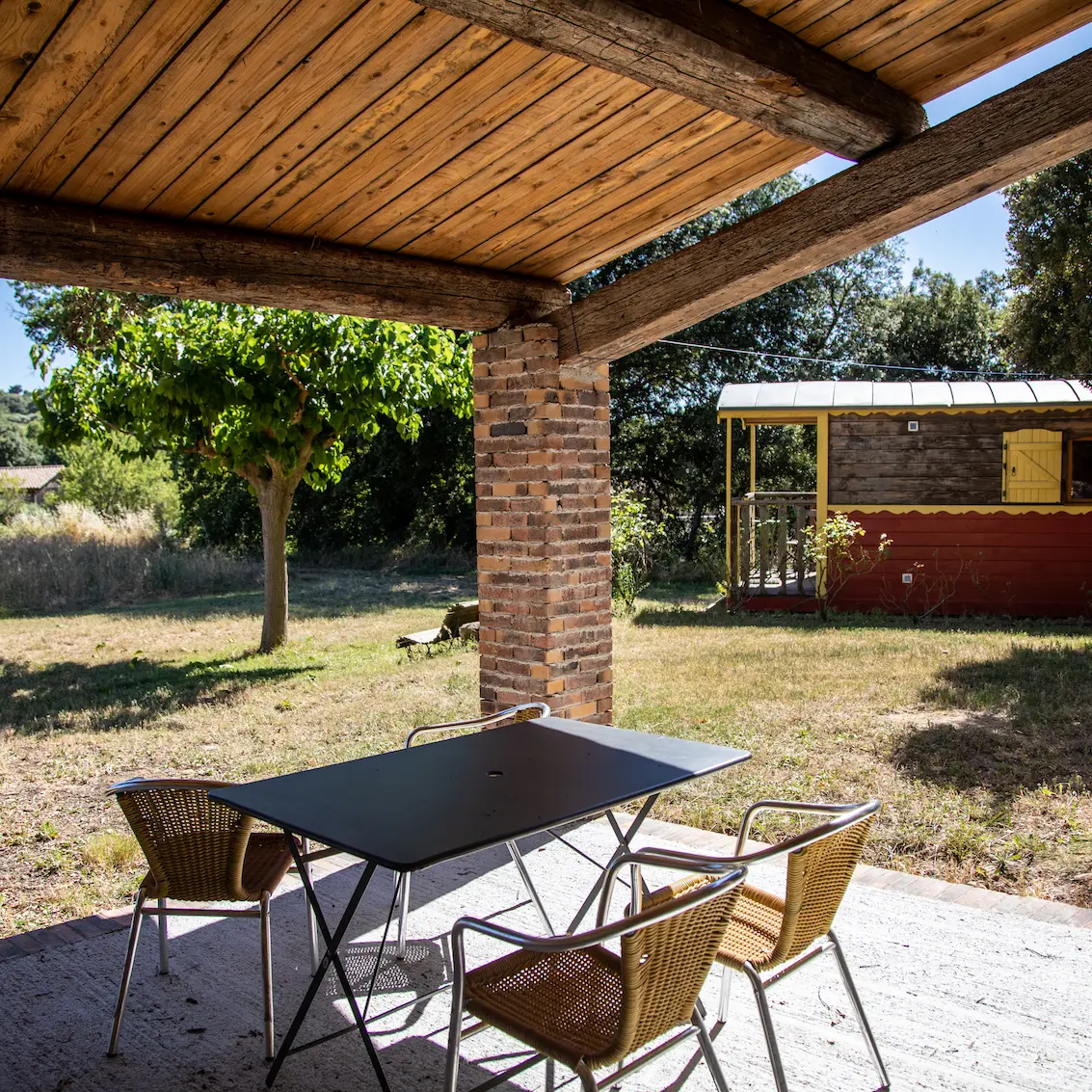Le séjour se prolonge à l’extérieur par une terrasse en bois, idéale pour prendre le petit-déjeuner face au soleil levant. En complément de la roulotte, un salon de jardin ainsi que des transats, vous attendent à l’ombre des chênes verts. Possibilité de déguster quelques grillades durant les beaux jours grâce à un BBQ électrique.