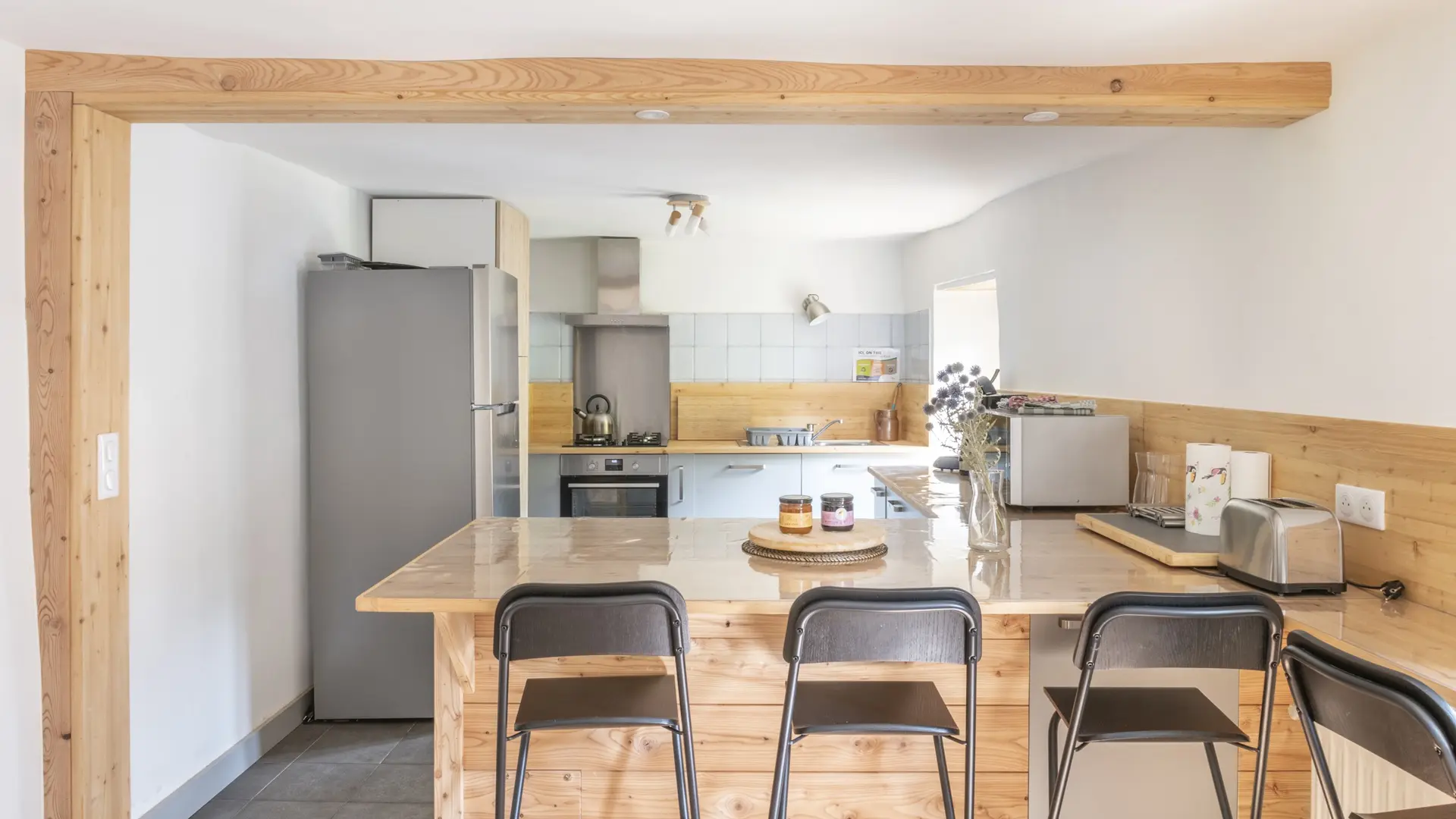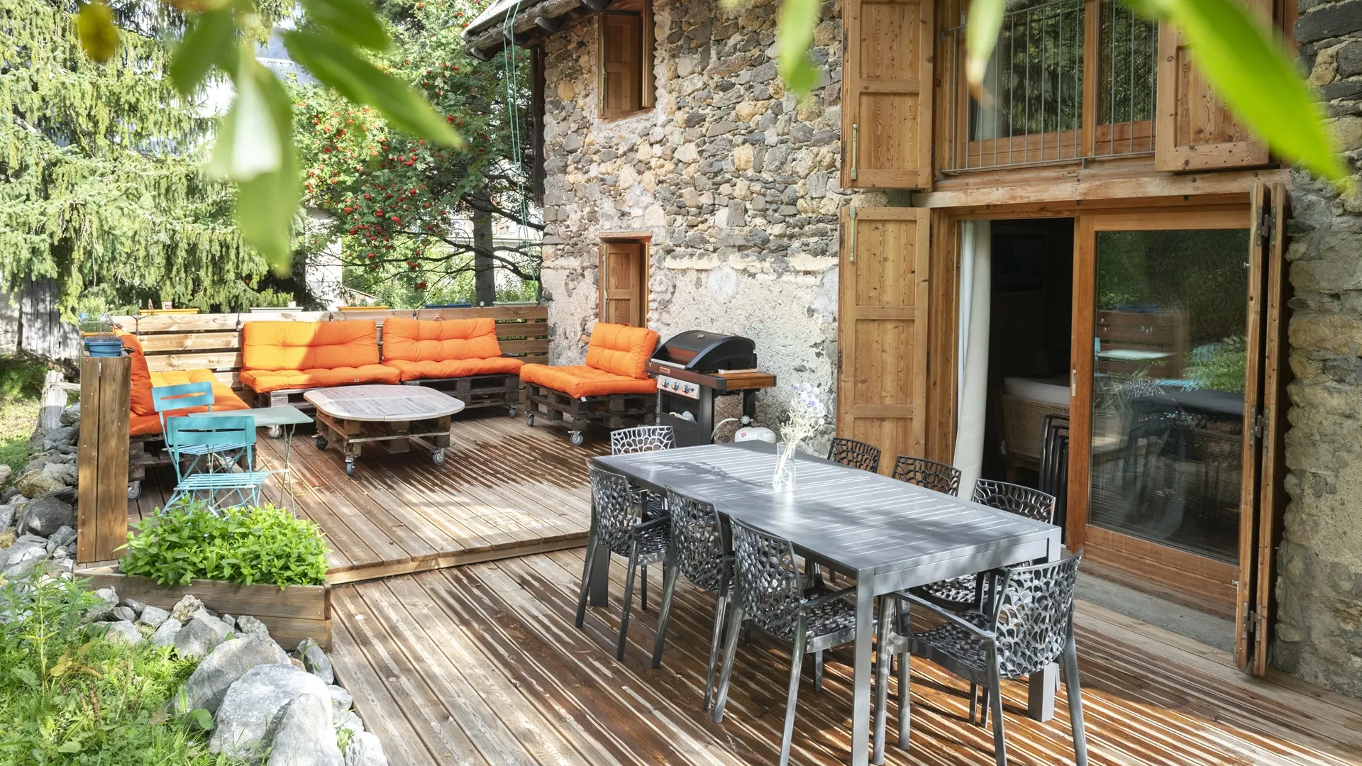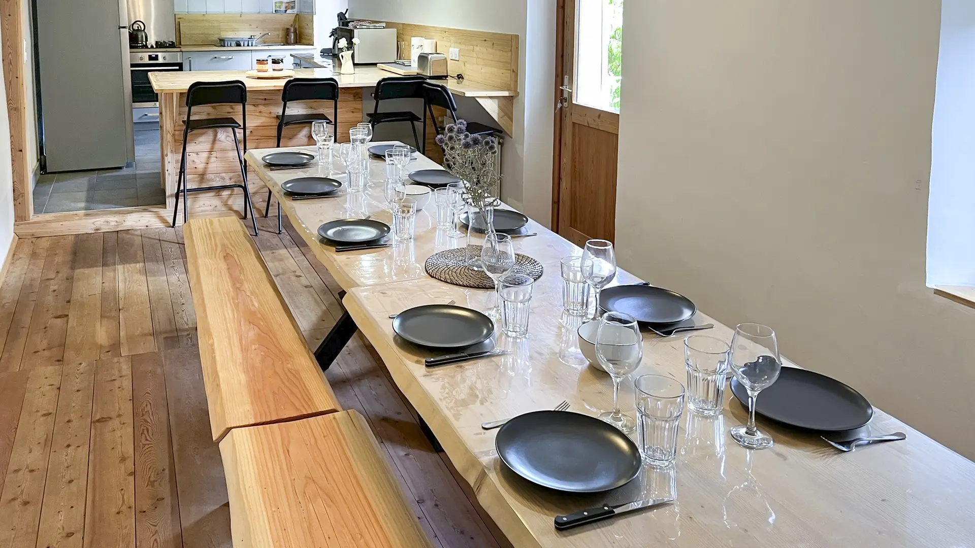 Cette grande maison névachaise, rénovée avec des matériaux nobles et dans un esprit chalet de montagne (meubles sur mesure en mélère, poutres apparentes, planchers en mélèze), vous offrira une ambiance cocooning et reposante, ainsi que de nombreux et spacieux espaces de vie.