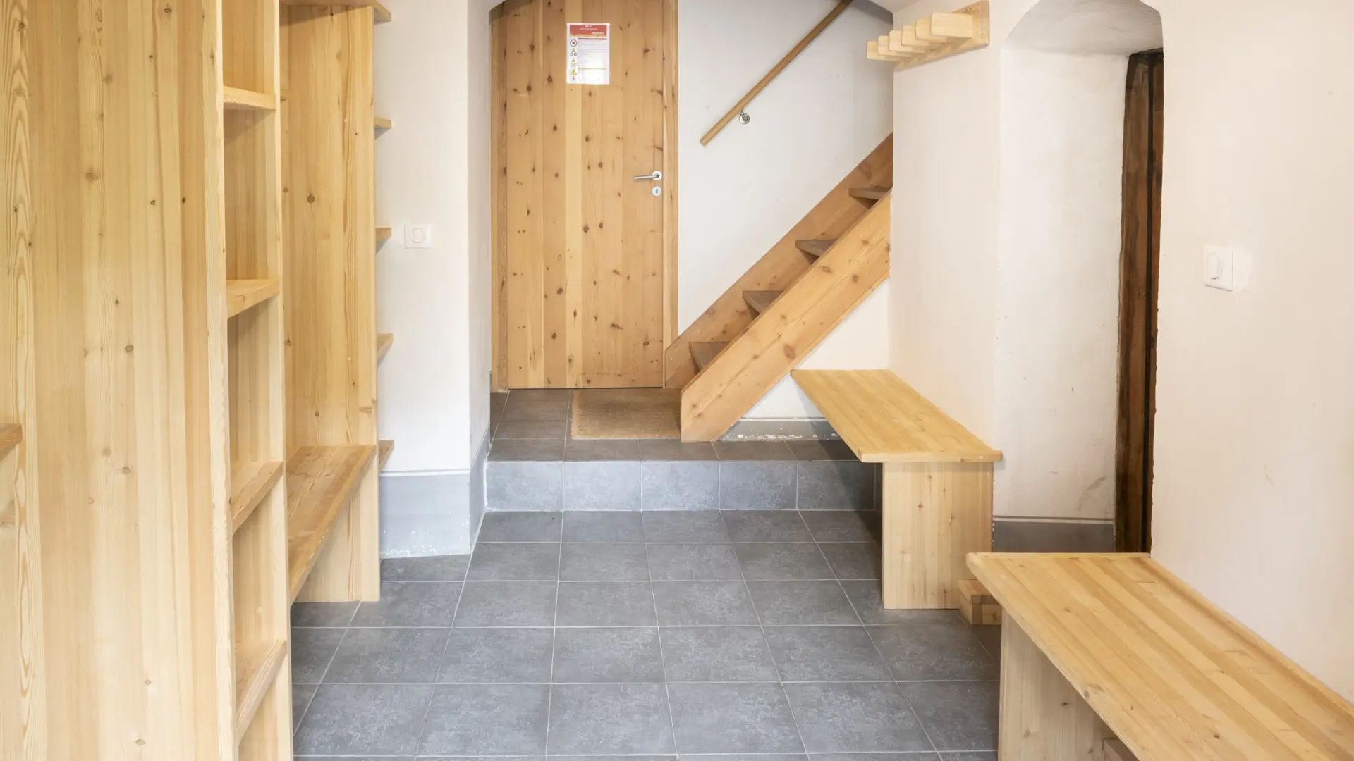 Au rez-de-chaussée : une entrée équipée de bancs et meubles en mélèze pour stocker les chaussures, manteaux et skis ; une pièce spacieuse pour stocker le matériel de ski, luges, etc ; un WC ; une buanderie équipée de machines à laver et sèche-linge.