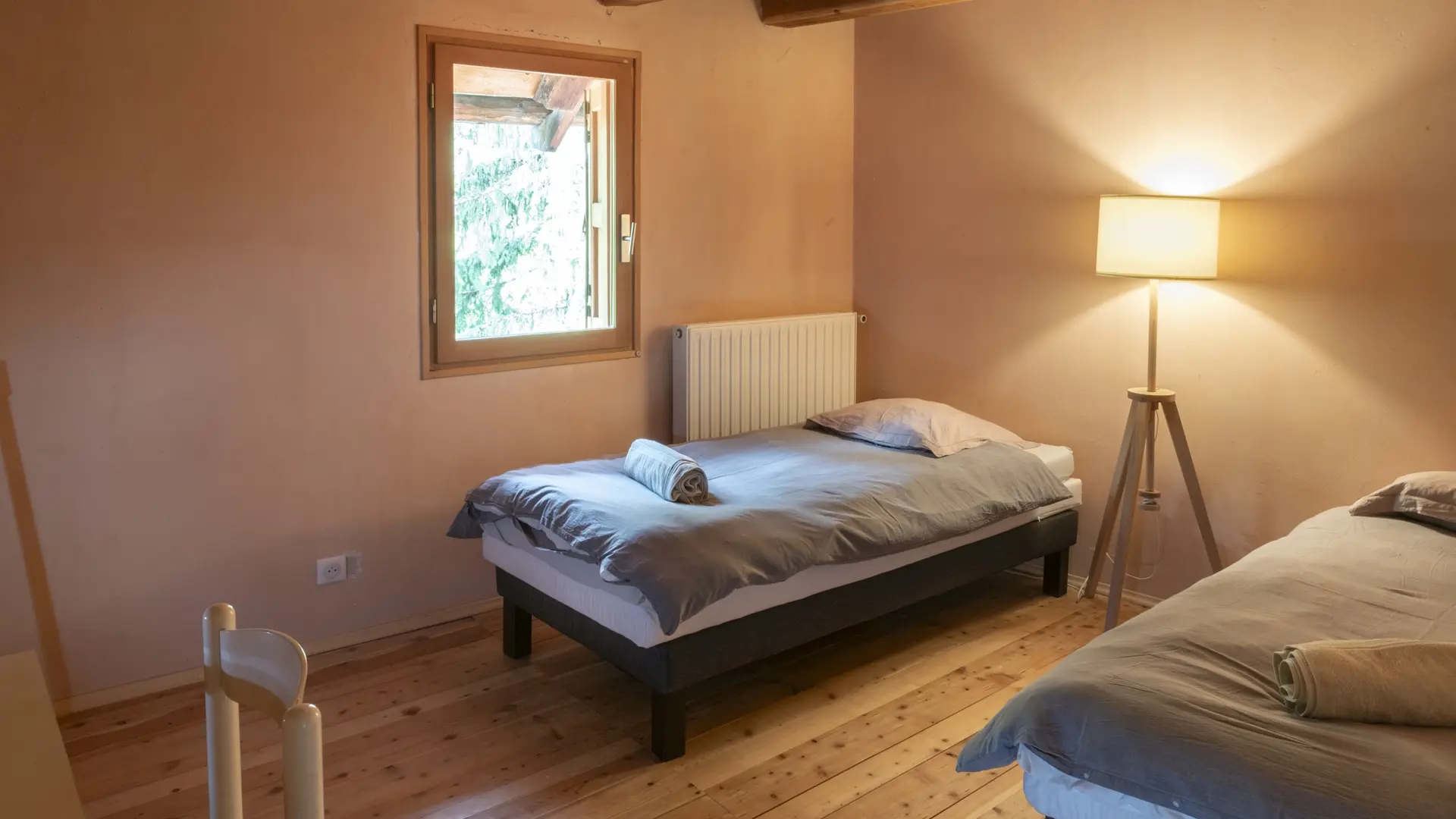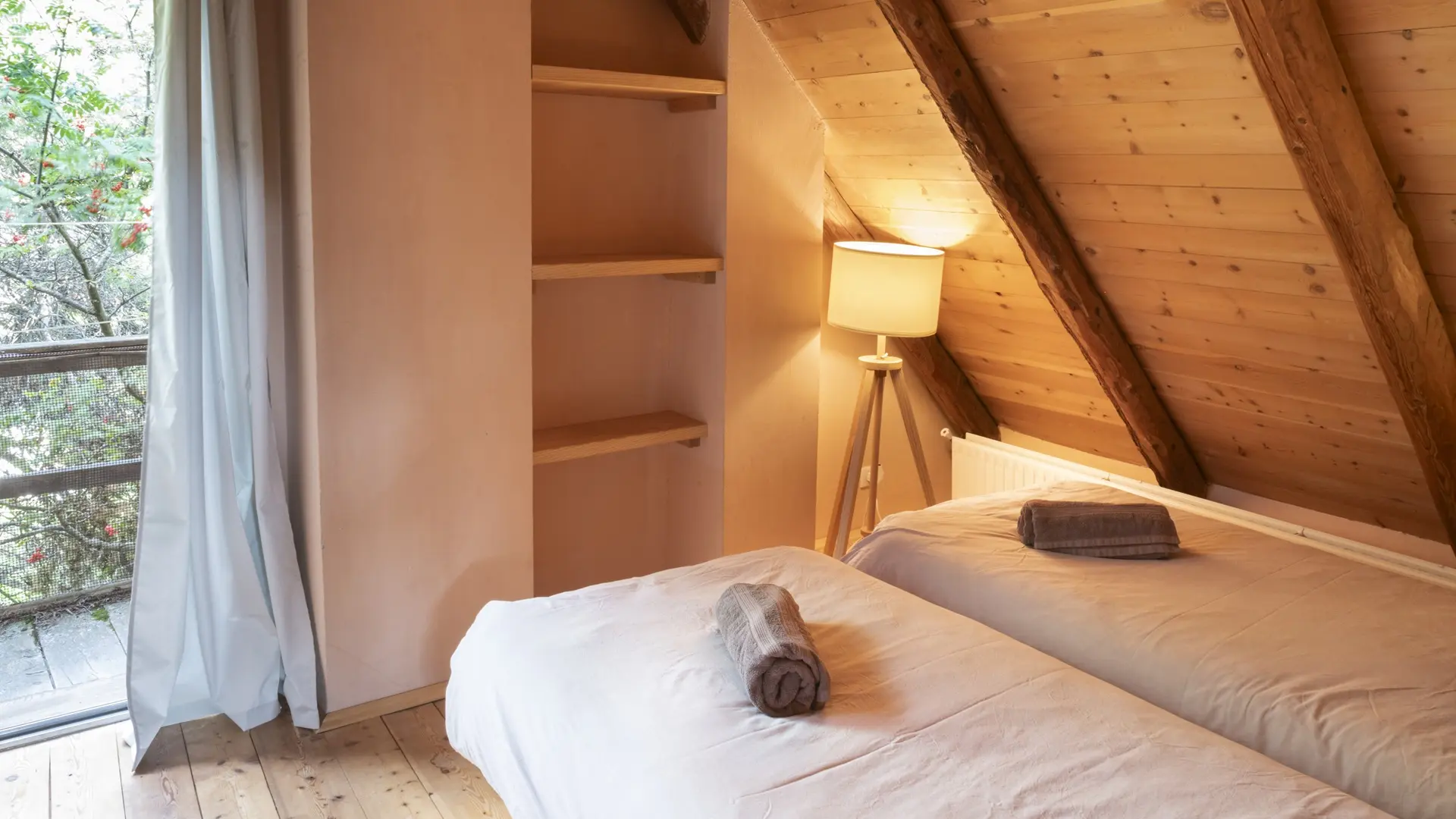 Les 3 chambres du 2ème étage ont été aménagées dans des teintes douces, assurant une ambiance feutrée et avec vue sur la verdure environnante. Une deuxième salle de bains est accessible face aux chambres, avec un WC, une vasque et une grande douche à l’italienne. Un petit salon complète ce 2ème niveau avec poele à bois, fauteuils cosy et accès au balcon.