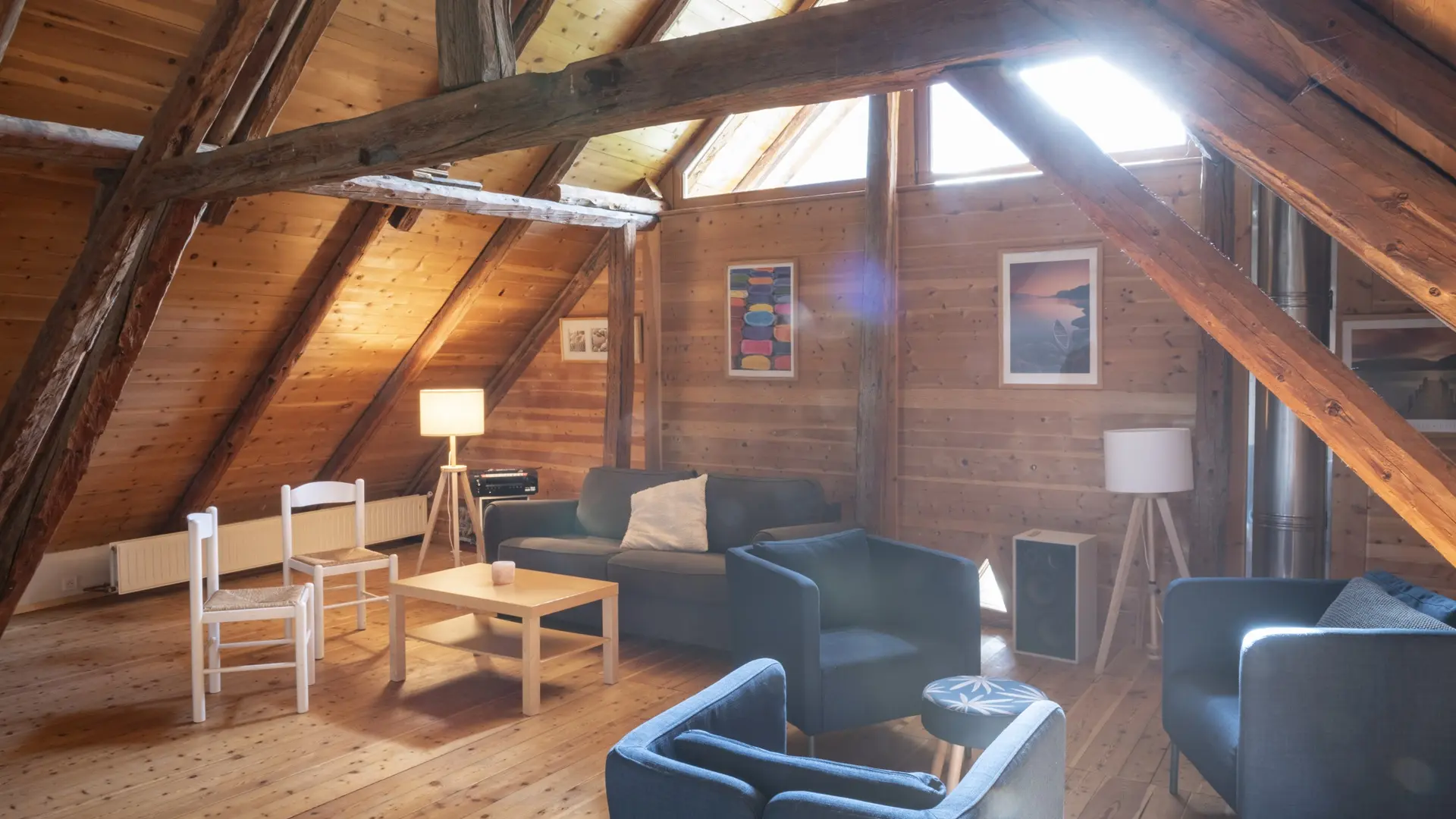 Un bel escalier mène aux pièces de vie du 1er niveau : un grand salon chaleureux ouvert sur le jardin, équipé d’un poêle de masse, d’un canapé spacieux et confortable et d’une grande bibliothèque sur mesure ; un petit salon pouvant faire office de coin bureau ou de chambre d’appoint pour 2 personnes ; une grande salle à manger permettant d’accueillir jusqu’à 15 convives et une cuisine ouverte, spacieuse et entièrement équipée ; une salle de bains équipée d’un WC, d’une vasque et d’une grande douche à l’italienne.