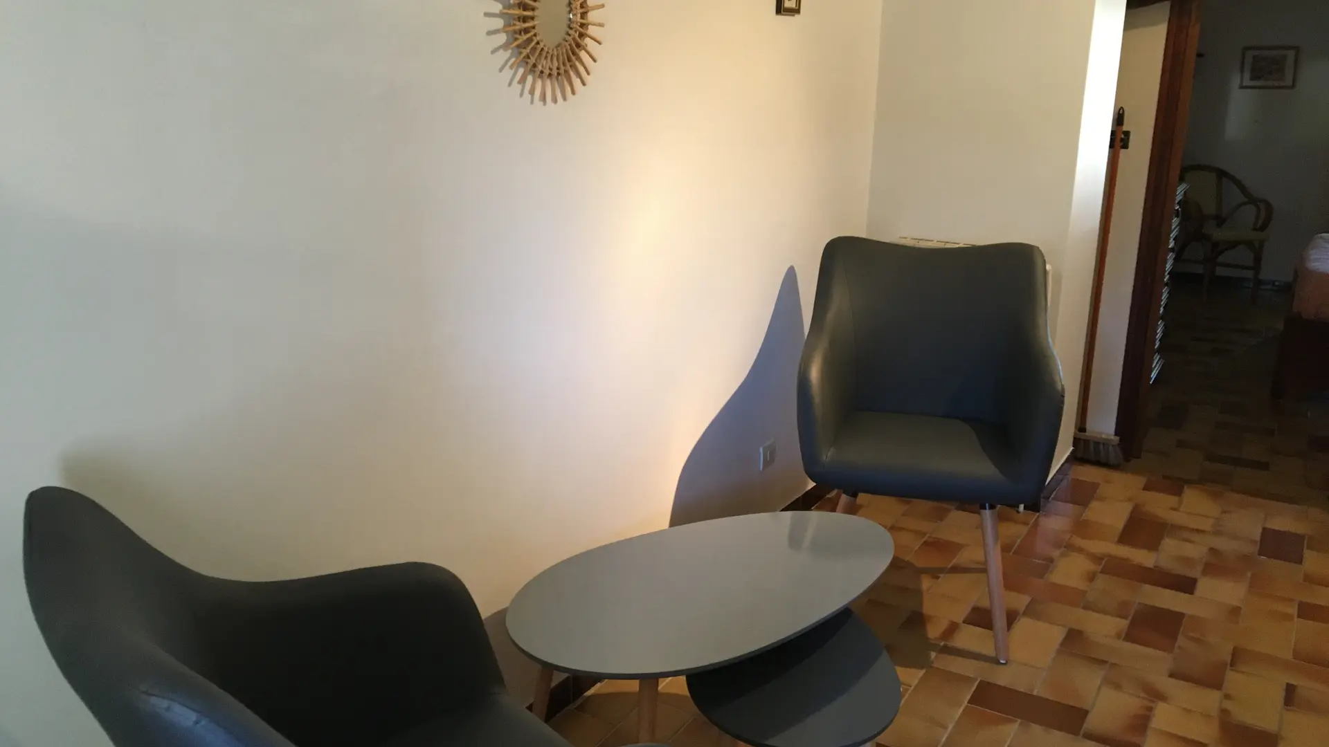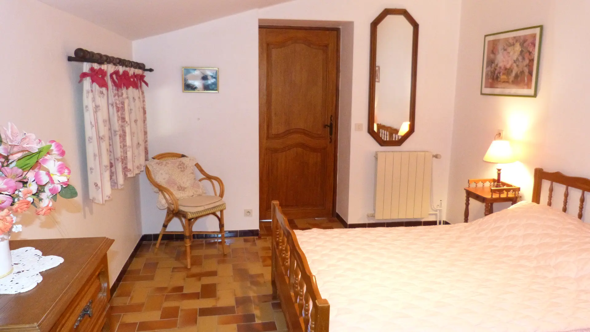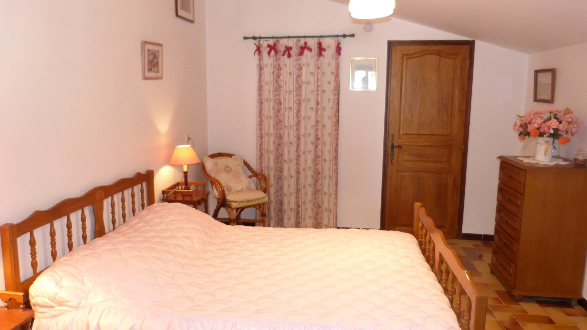 - 1 grande chambre avec lit en 160 cm (Draps fournis et lit fait à l'arrivée), deux chevets, commode, placard de rangement, fauteuils.
