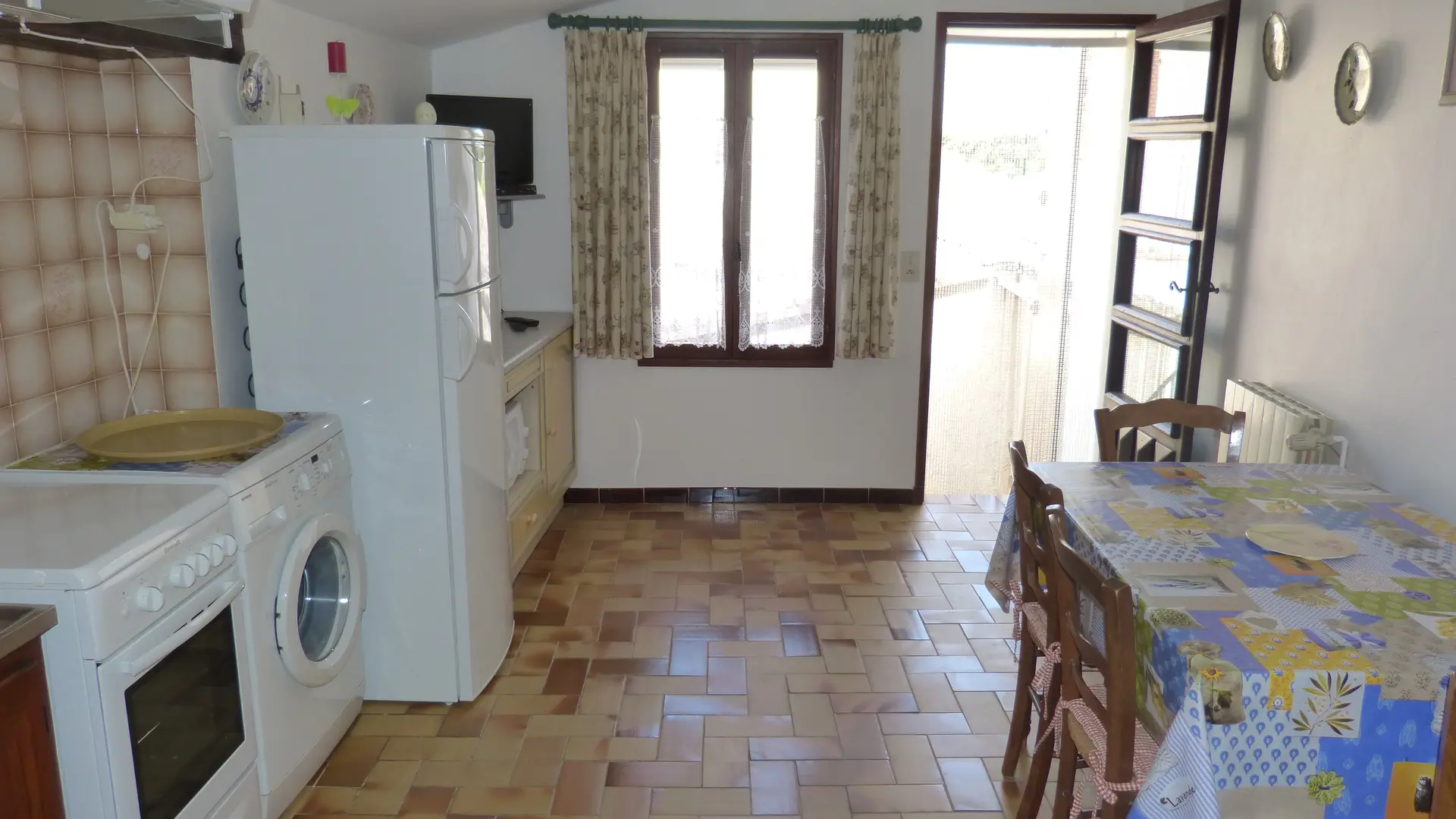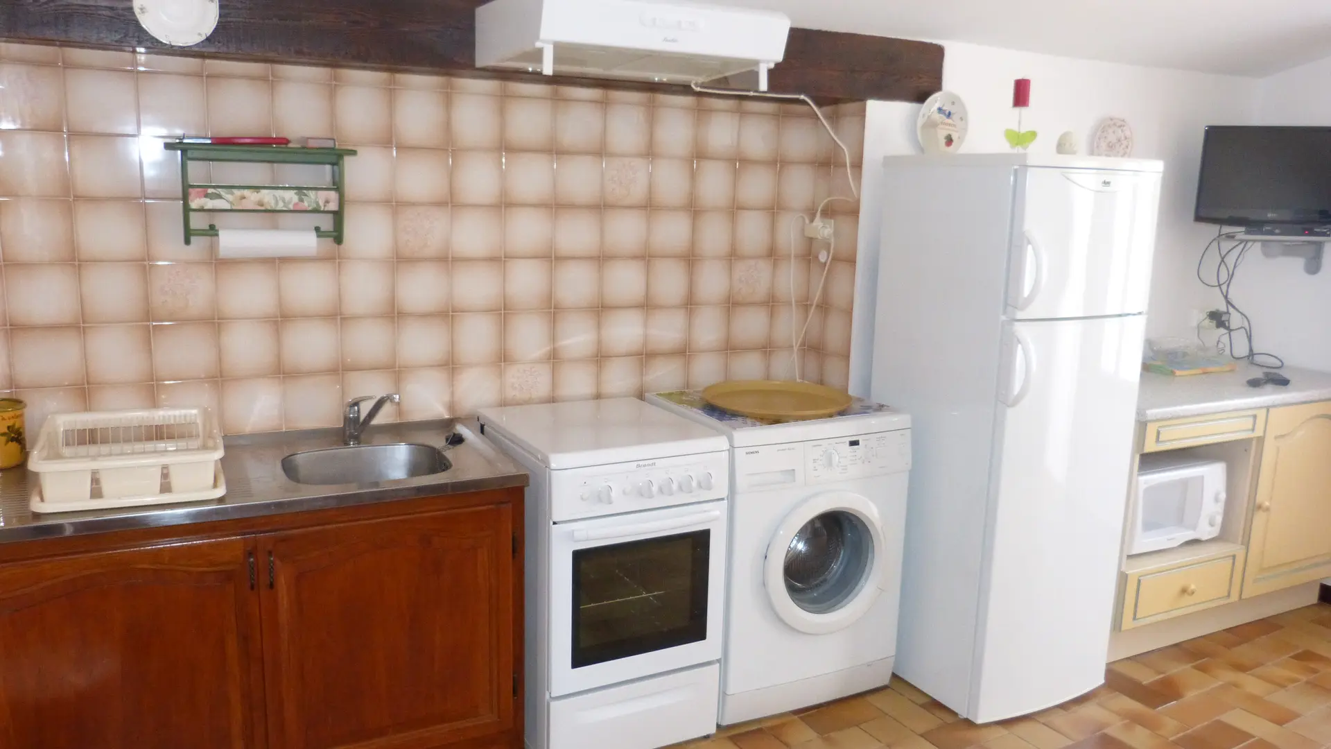 - Cuisine équipée avec gazinière 4 feux gaz et four, frigo-congélateur, lave-linge, micro-ondes, cafetière + cafetière Nespresso, bouilloire électriques, grille pain, aspirateur, télévision écran plant, batterie de cuisine complète, fer et table à repasser.