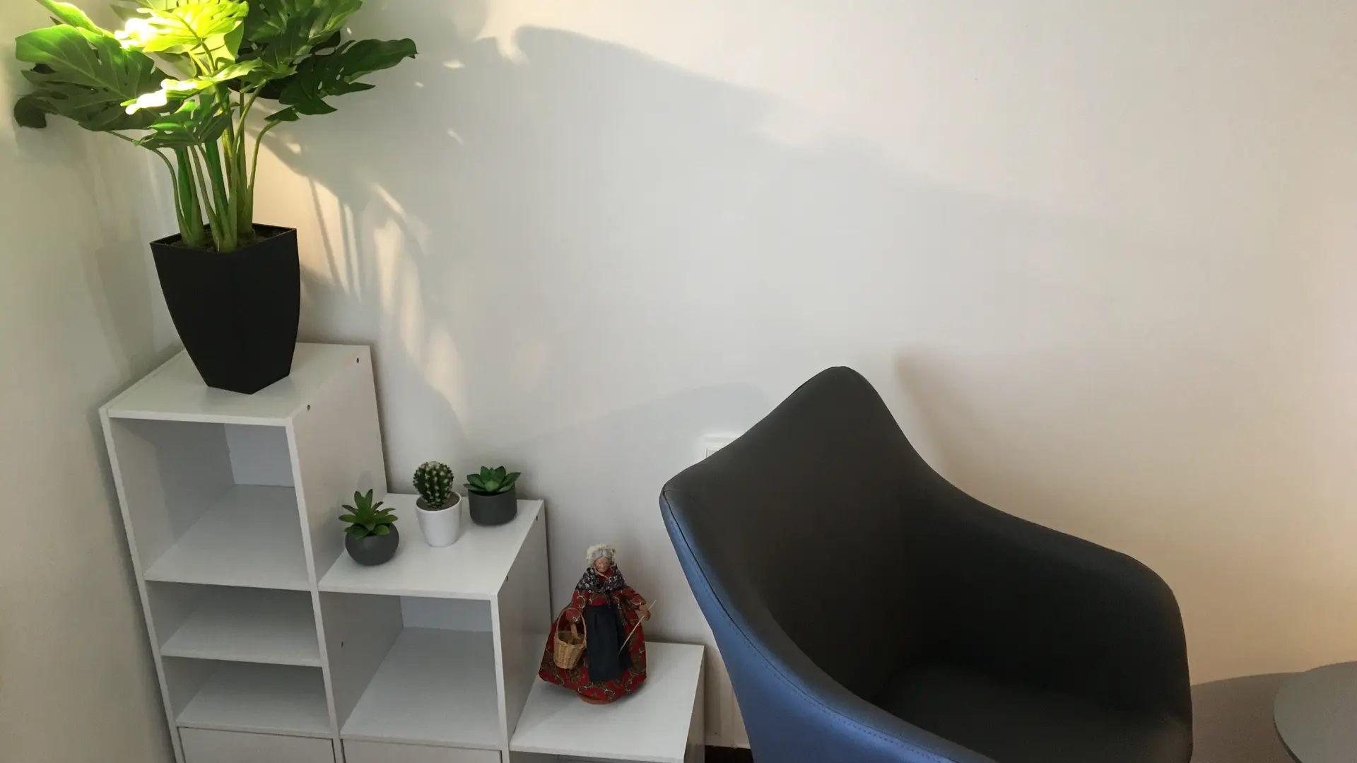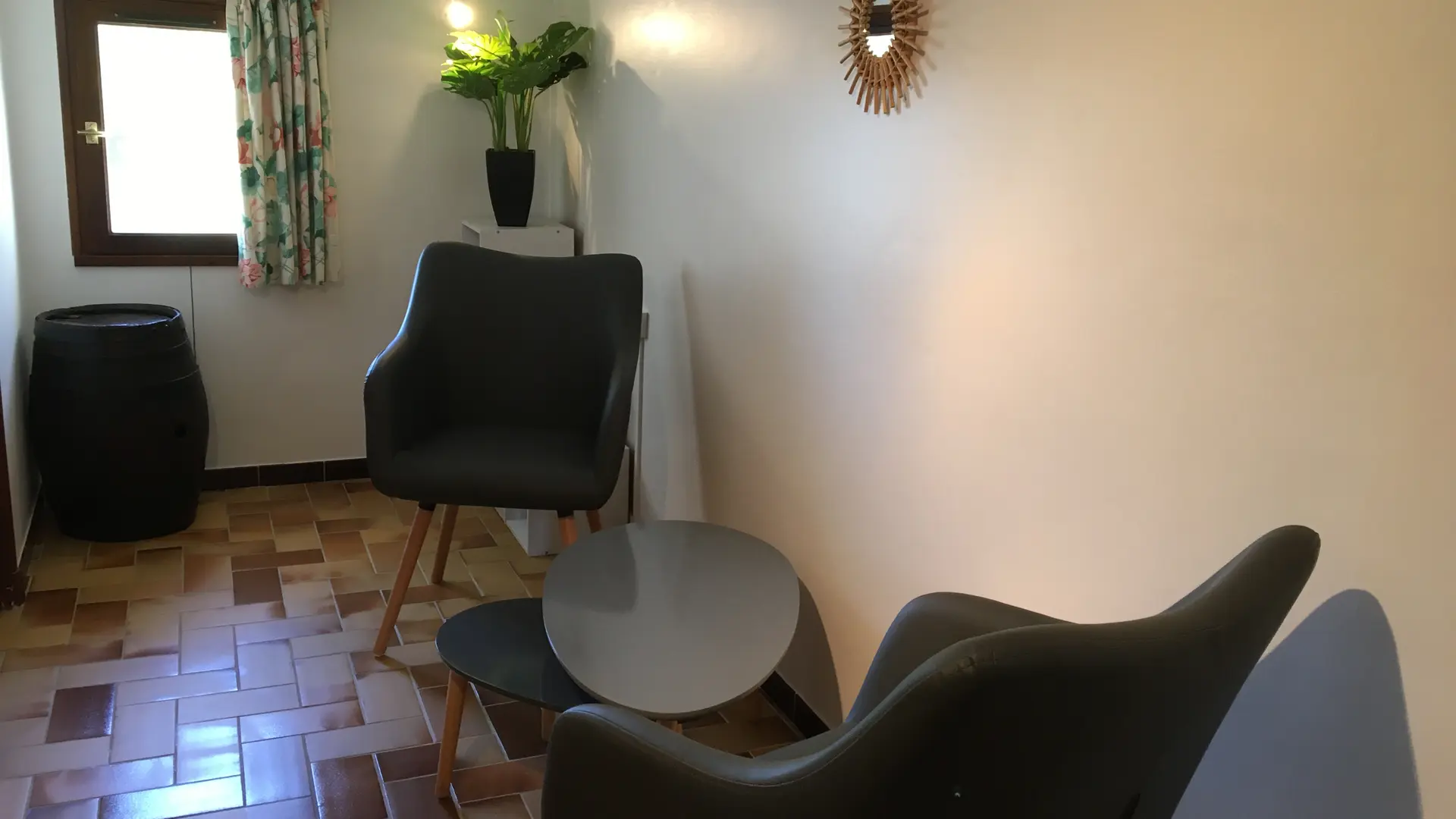 - 1 petite salle de détente avec deux fauteuils en cuir et une table de salon.