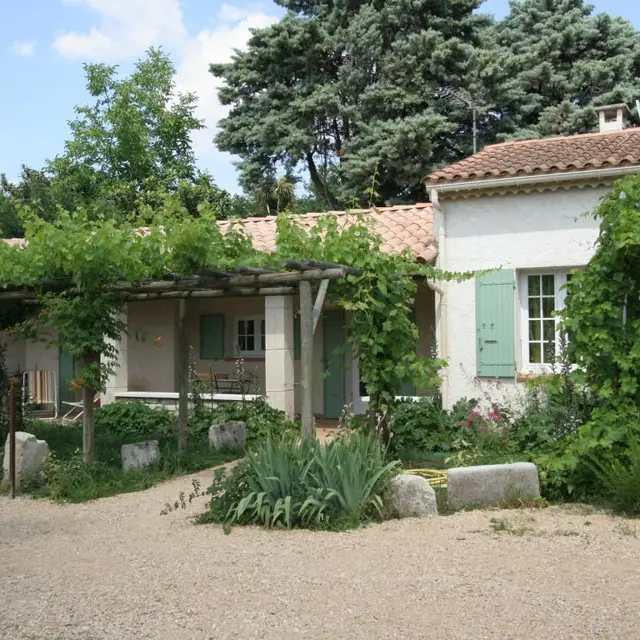 A l'entrée de St Rémy de Provence, propriété proposant 4 gîtes. Le gîte "La Vigne" est sans vis à vis, à côté du gîte "Le Soleil". Maisonnette de plain pied : cuisine (plaque 4 feux gaz, four, micro ondes, réfrigérateur-congélateur), salon avec TV, chambre avec lit 2 personnes(140x190), salle d'eau avec douche à l'Italienne, vasque et WC. Chauffage électrique. Jardin privatif avec mobilier de jardin et barbecue, terrasse privative avec auvent de 20 m² accessible par la cuisine ou le salon.