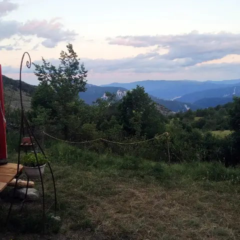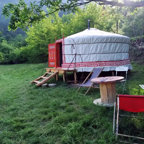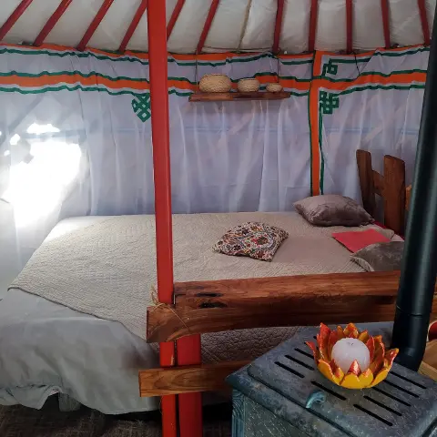 Salle de bain et cuisine sont en libre service dans l'atelier de poterie. Des toilettes sèches sont installées à côté de la yourte. Il n'y a ni eau, ni électricité dans la yourte, prévoir des lampes frontales.
